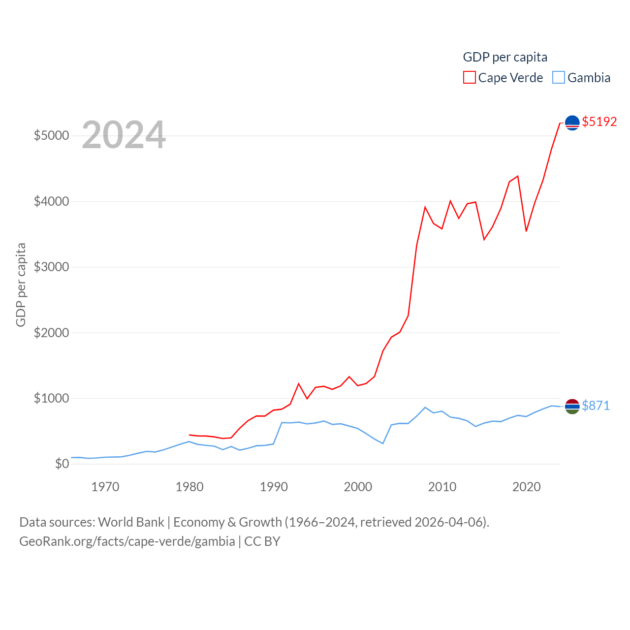 By GDP, Cape Verde ranks 172/197 ($2.73B) and The Gambia ranks 174/197 ($2.4B). By GDP per capita, Cape Verde ranks 118/197 ($5,192), while The Gambia ranks 183/197 ($871).