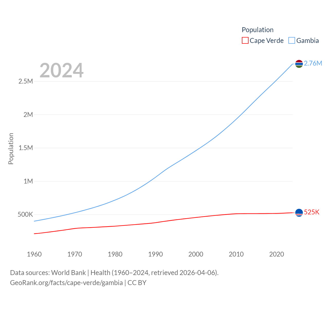 Cape Verde has a population of 525K (ranked 169/197), compared with 2.76M in The Gambia (ranked 140/197). Cape Verde's land area is 1,556 sq mi versus 3,907 sq mi for The Gambia (ranked 167th vs. 161st).