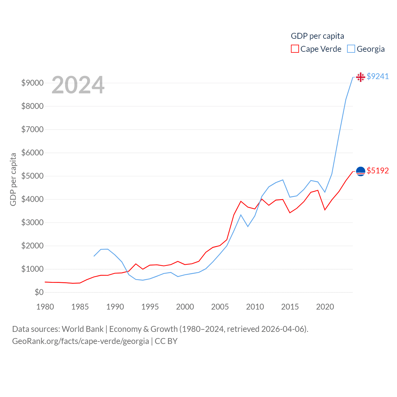 By GDP, Cape Verde ranks 172/197 ($2.73B) and Georgia ranks 107/197 ($34.2B). By GDP per capita, Cape Verde ranks 118/197 ($5,192), while Georgia ranks 89/197 ($9,241).