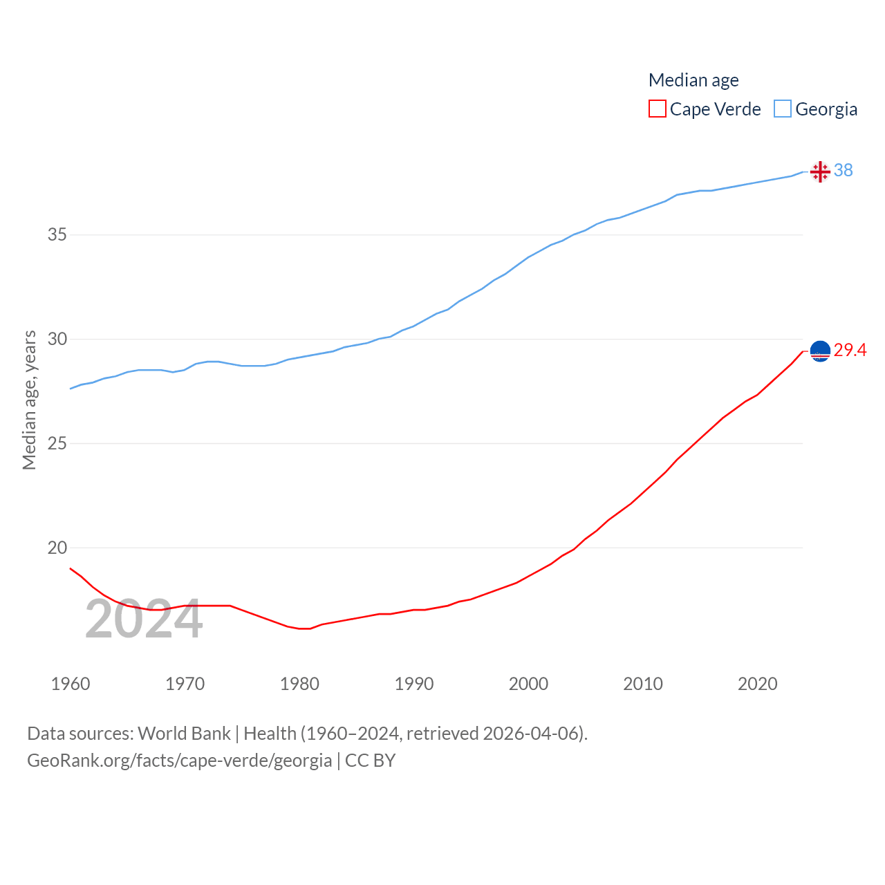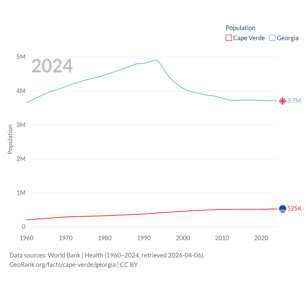 Cape Verde has a population of 525K (ranked 169/197), compared with 3.7M in Georgia (ranked 130/197). Cape Verde's land area is 1,556 sq mi versus 26,830 sq mi for Georgia (ranked 167th vs. 118th).