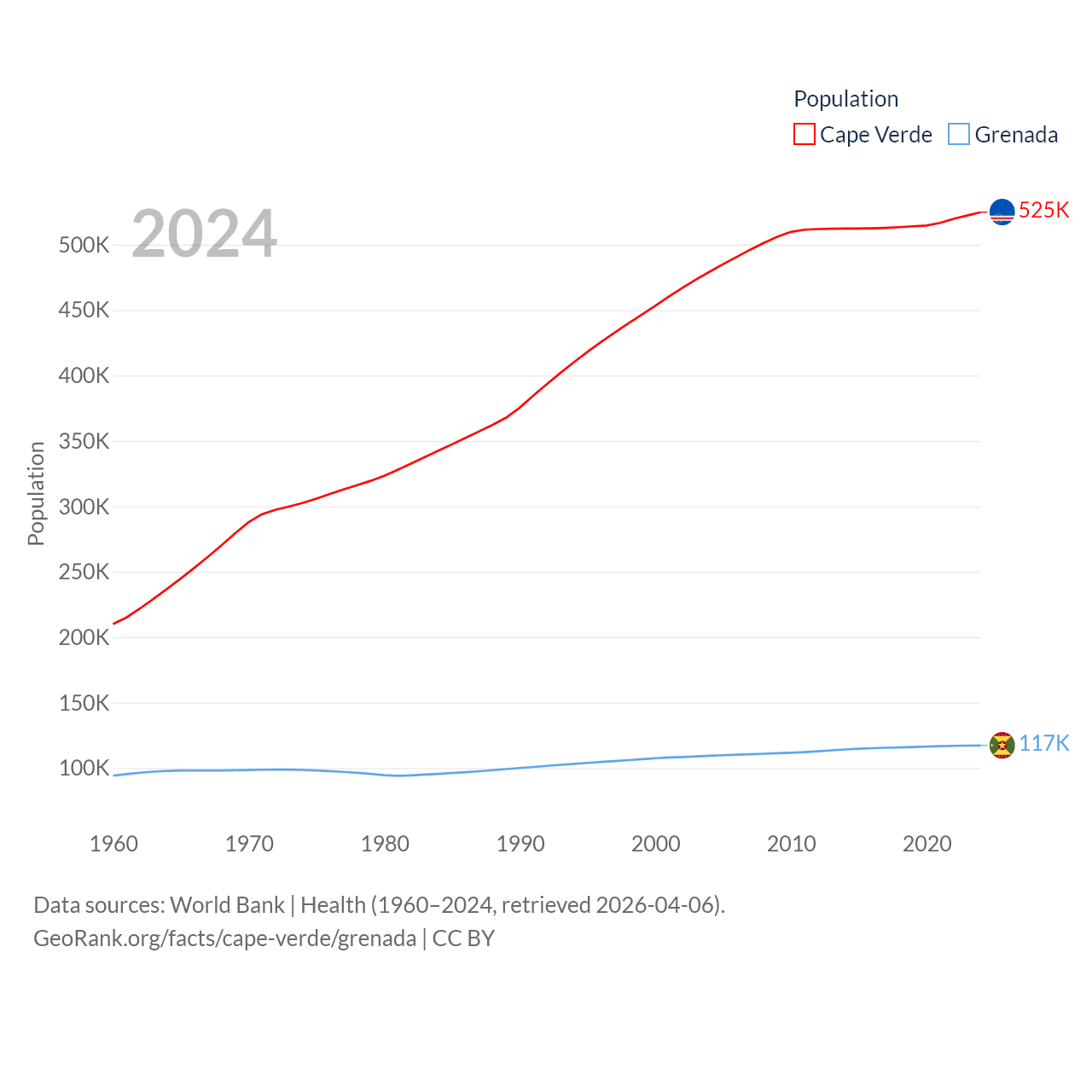 Cape Verde has a population of 525K (ranked 169/197), compared with 117K in Grenada (ranked 182/197). Cape Verde's land area is 1,556 sq mi versus 131.3 sq mi for Grenada (ranked 167th vs. 186th).