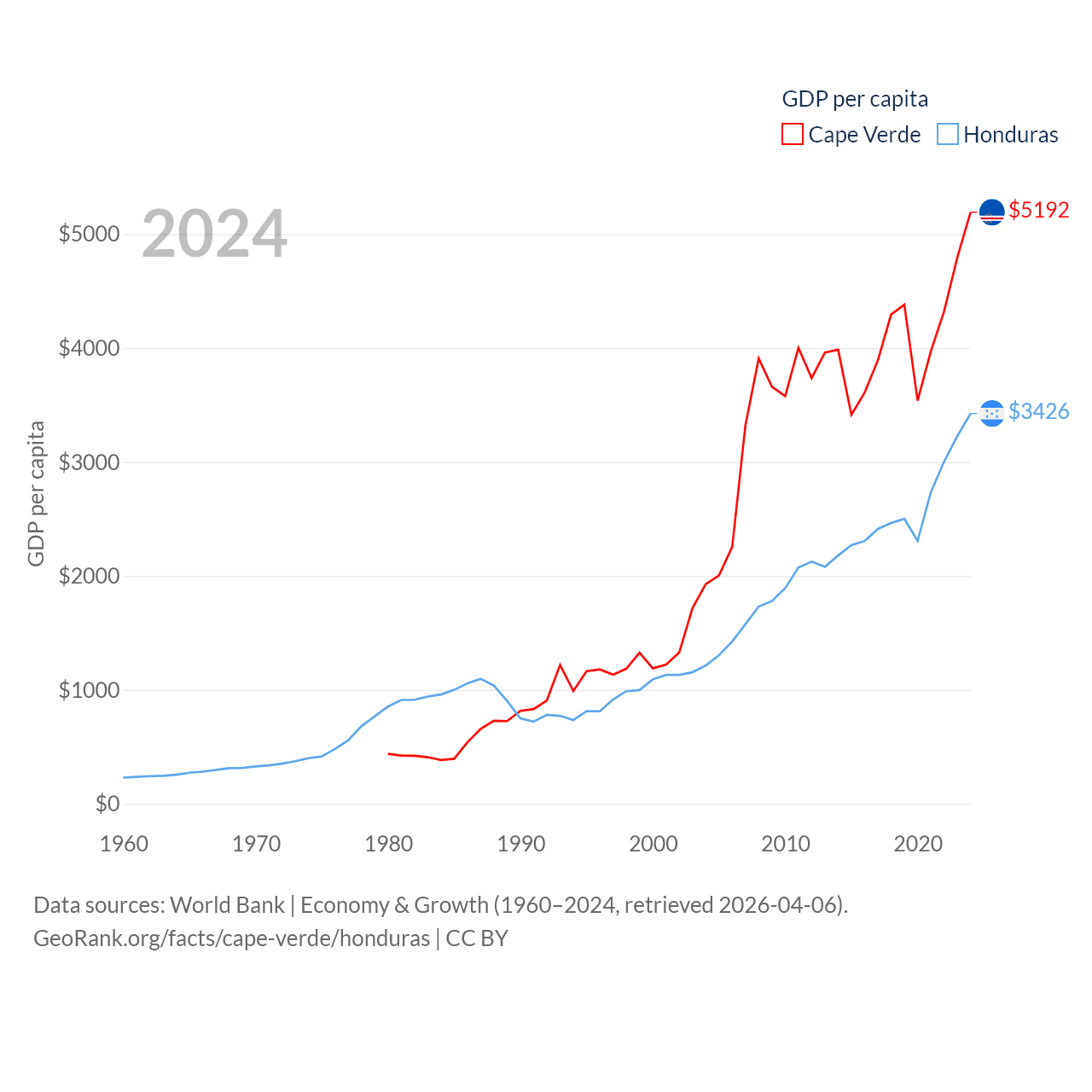 By GDP, Cape Verde ranks 172/197 ($2.73B) and Honduras ranks 104/197 ($37.1B). By GDP per capita, Cape Verde ranks 118/197 ($5,192), while Honduras ranks 136/197 ($3,426).