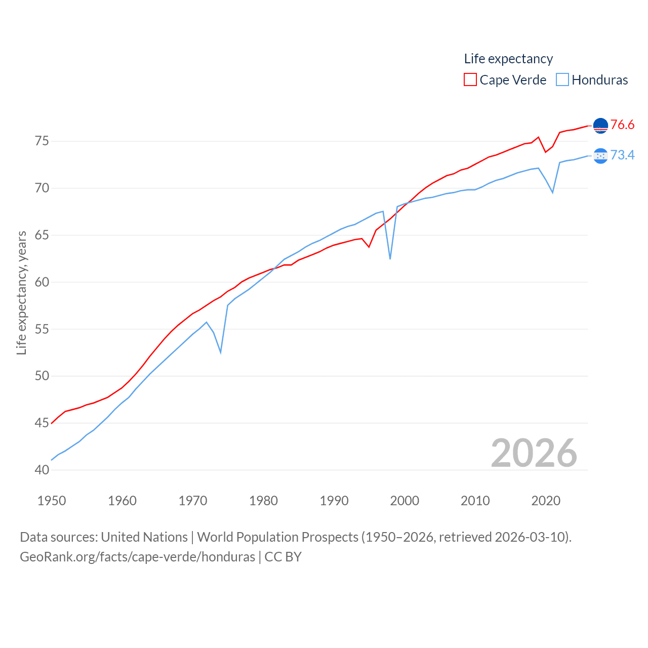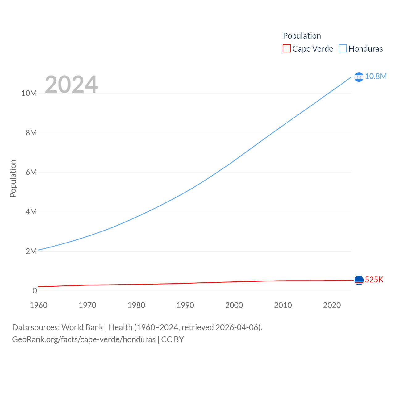 Cape Verde has a population of 525K (ranked 169/197), compared with 10.8M in Honduras (ranked 89/197). Cape Verde's land area is 1,556 sq mi versus 43,201 sq mi for Honduras (ranked 167th vs. 100th).