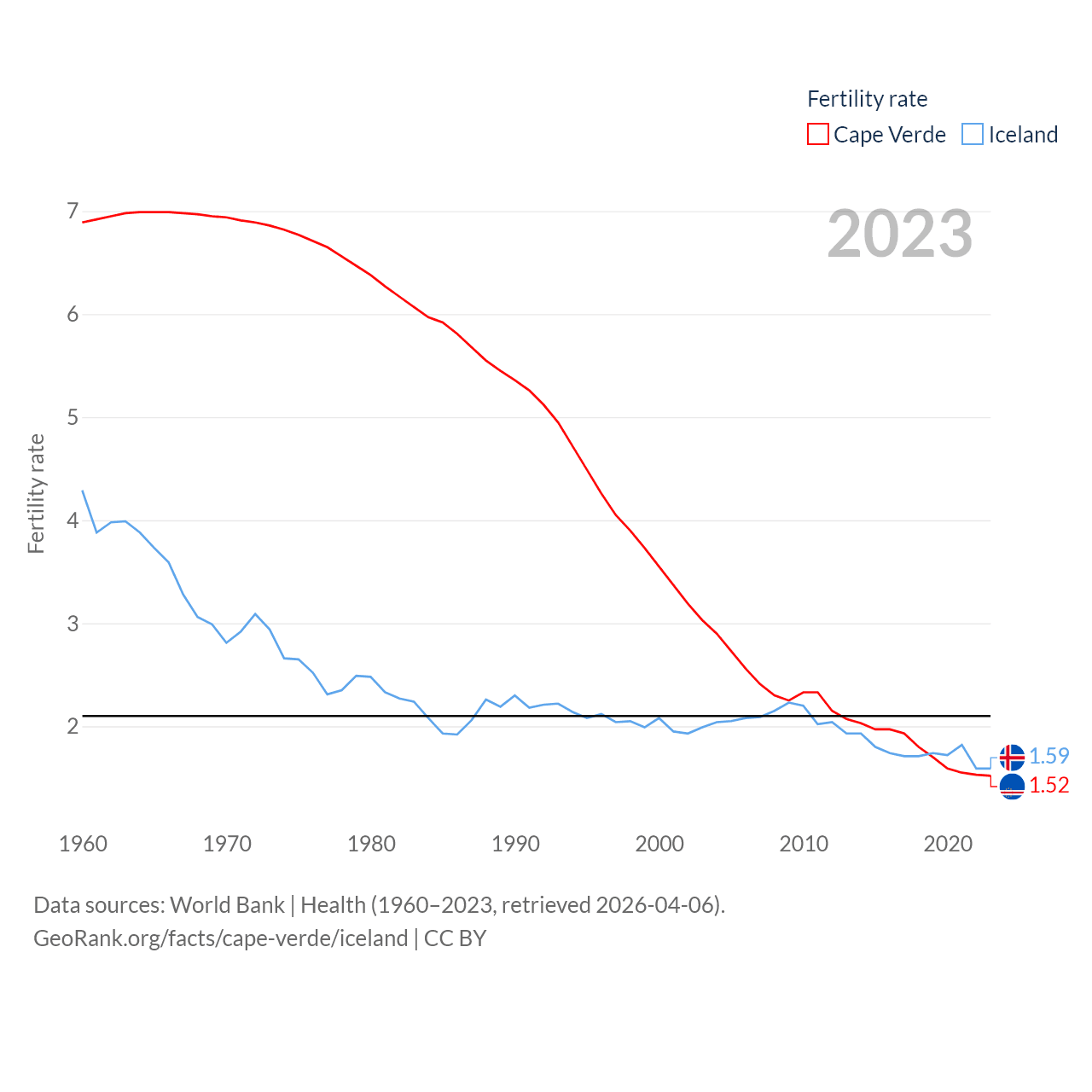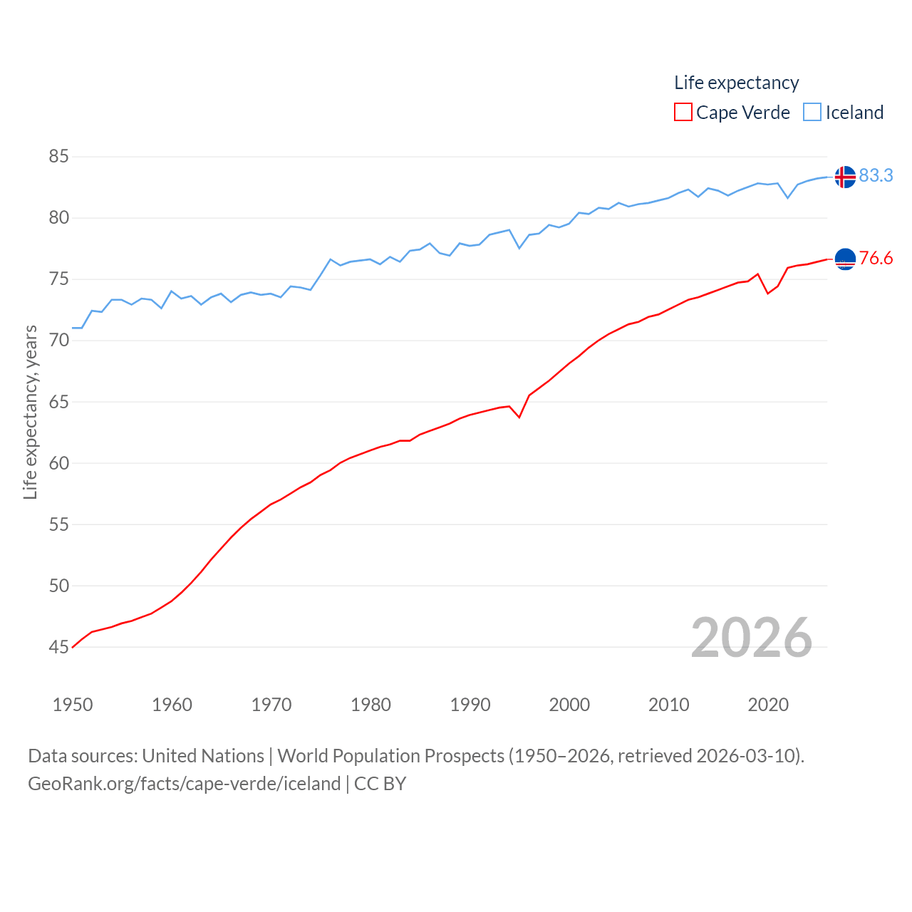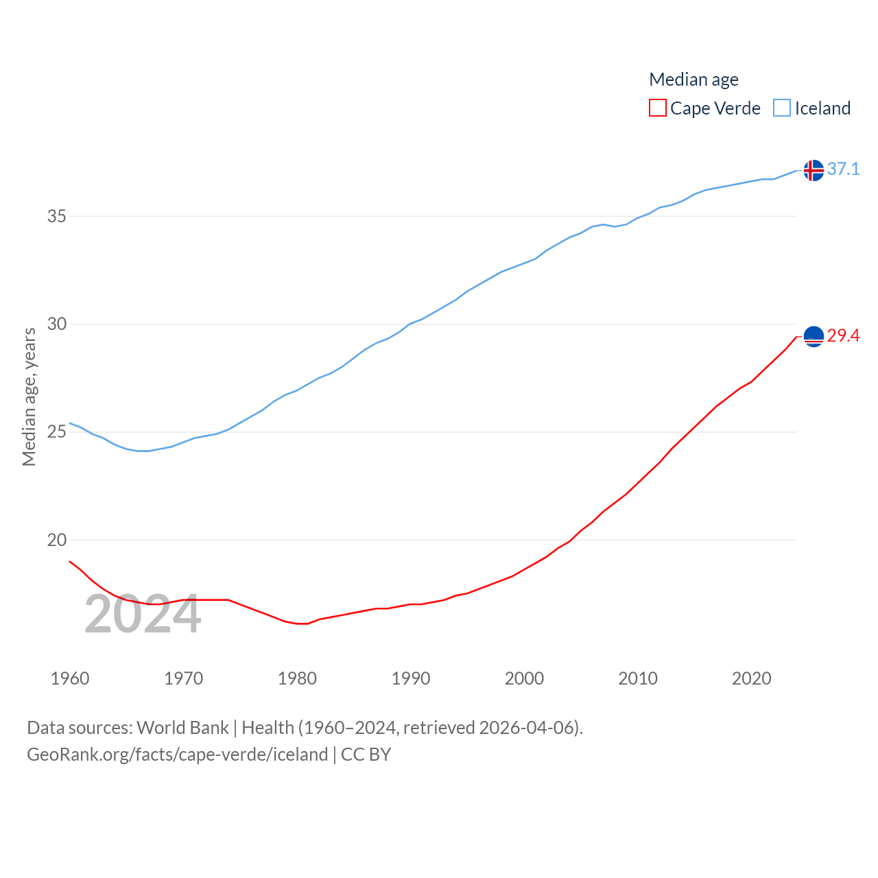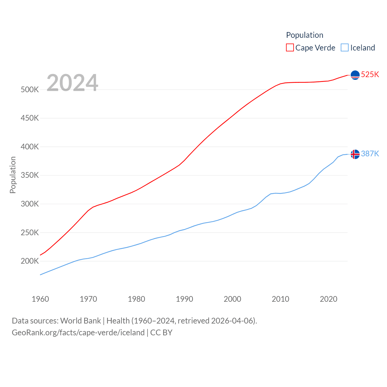 Cape Verde has a population of 525K (ranked 169/197), compared with 387K in Iceland (ranked 173/197). Cape Verde's land area is 1,556 sq mi versus 38,931 sq mi for Iceland (ranked 167th vs. 104th).