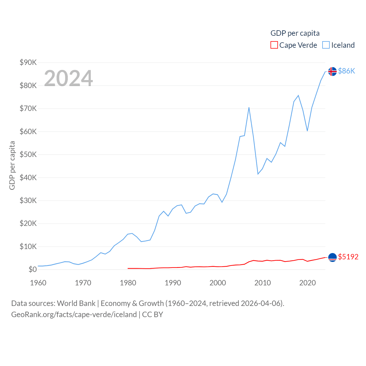 By GDP, Cape Verde ranks 172/197 ($2.73B) and Iceland ranks 108/197 ($33.3B). By GDP per capita, Cape Verde ranks 118/197 ($5,192), while Iceland ranks 9/197 ($86,041).