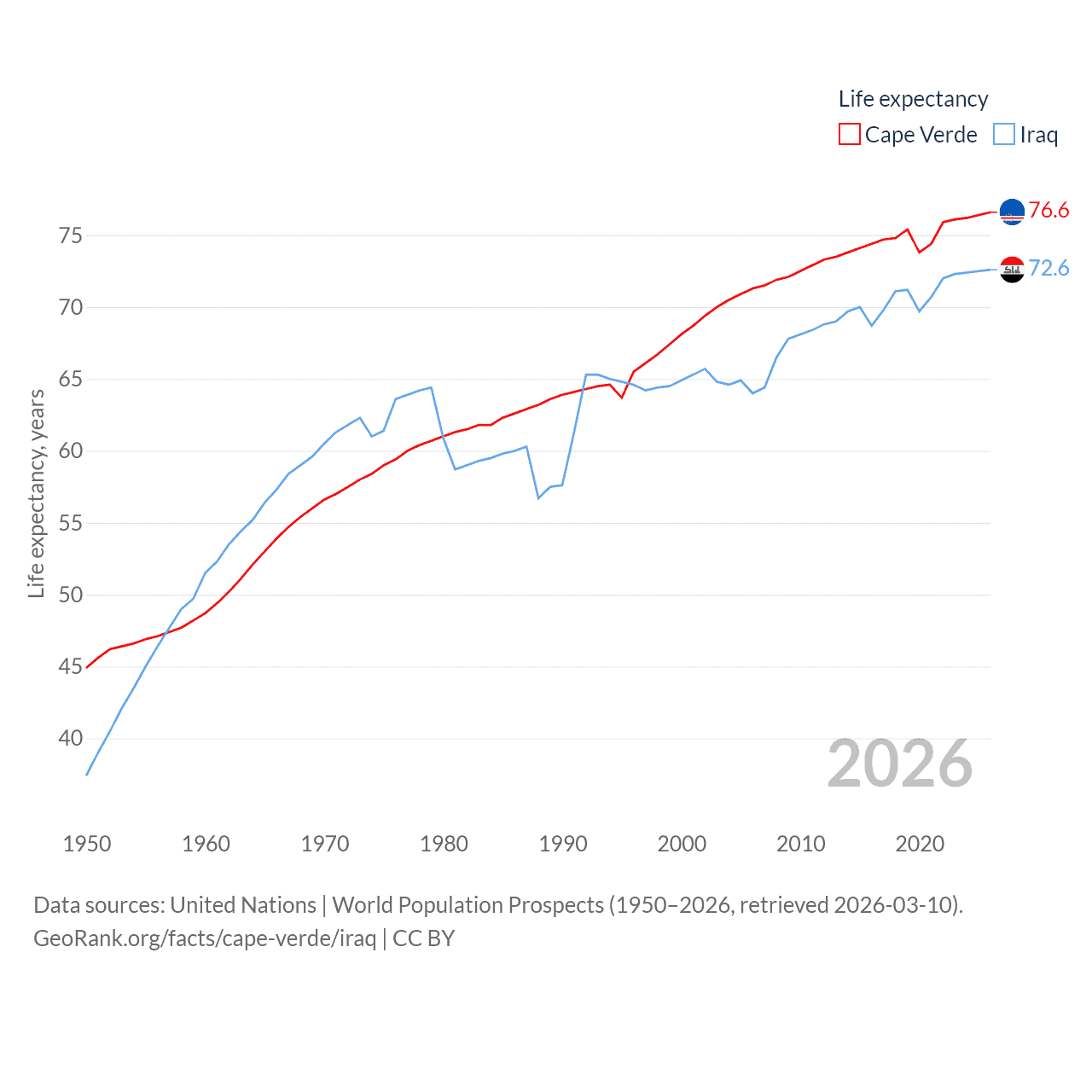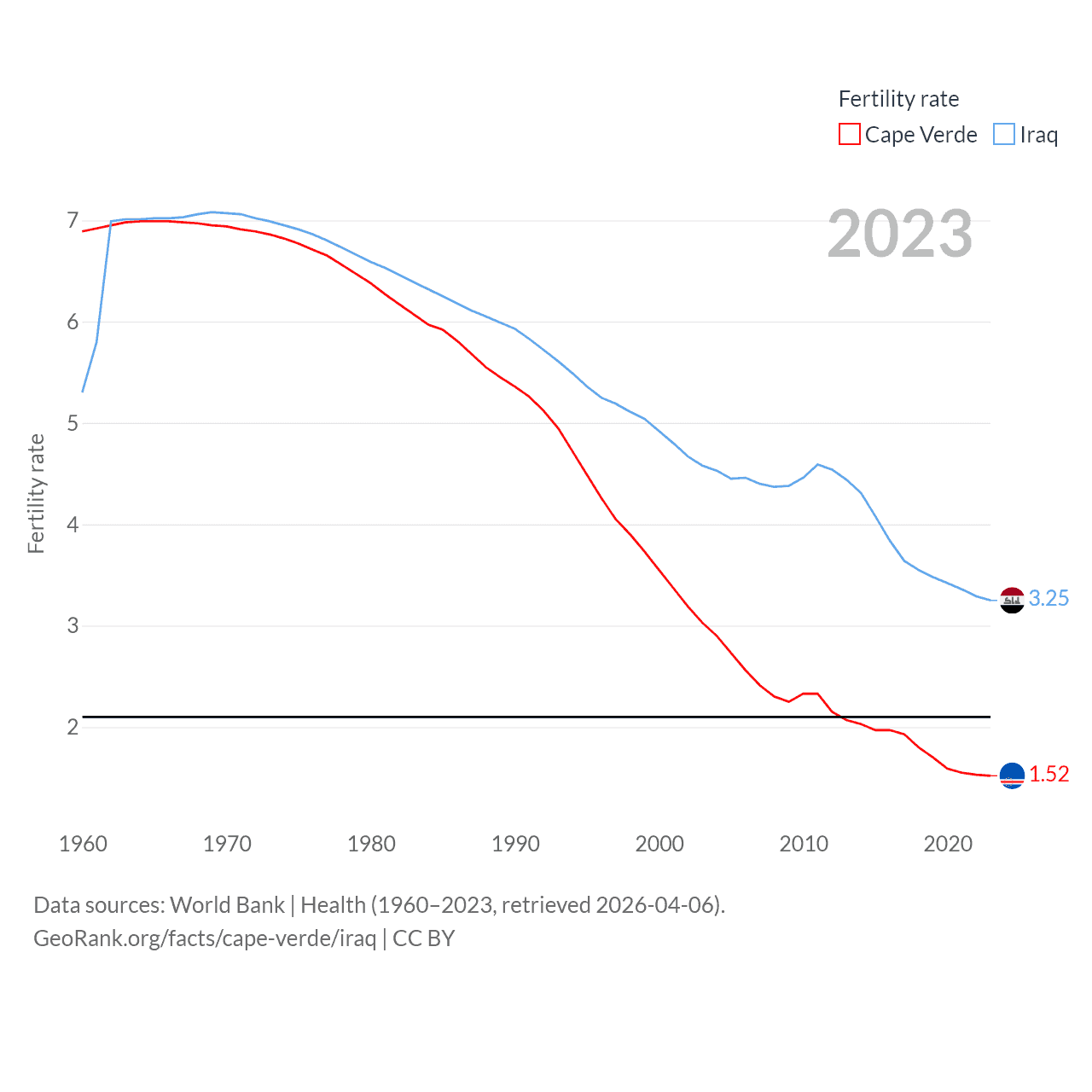 Cape Verde has a population of 525K (ranked 169/197), compared with 46M in Iraq (ranked 34/197). Cape Verde's land area is 1,556 sq mi versus 167,619 sq mi for Iraq (ranked 167th vs. 57th).