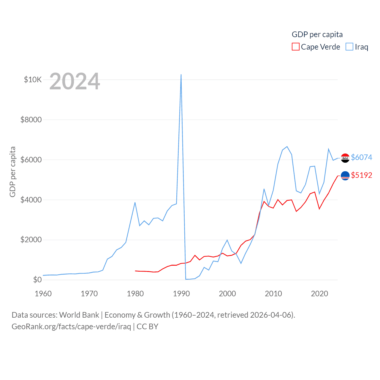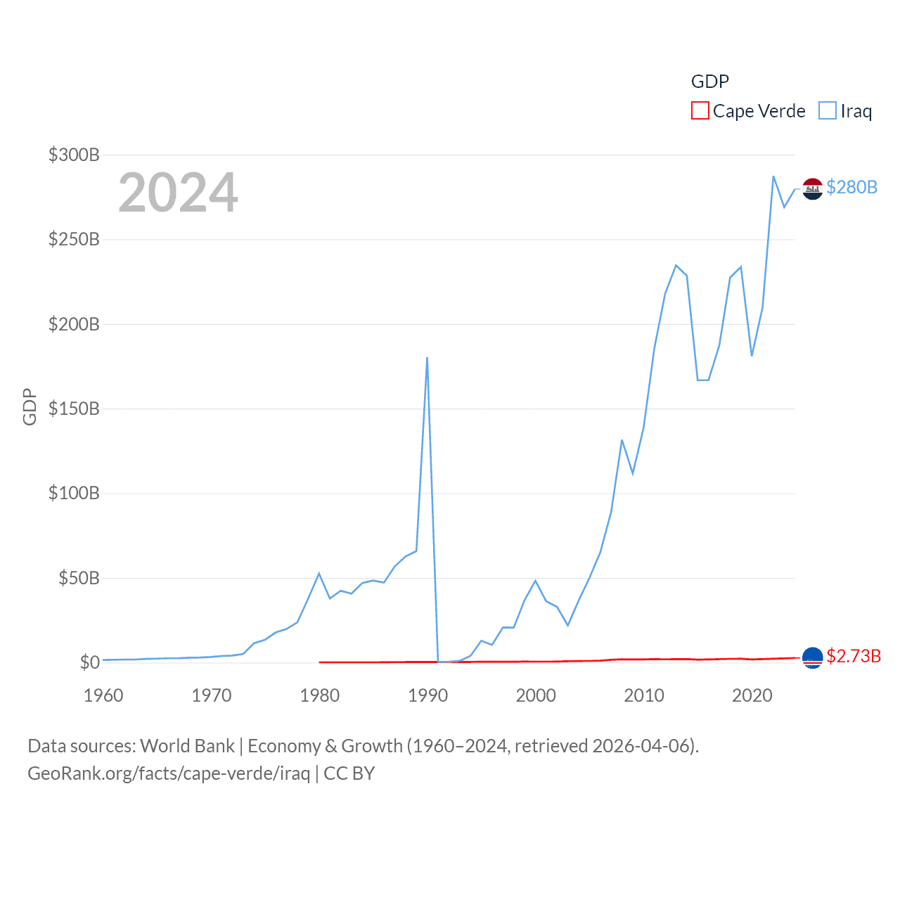By GDP, Cape Verde ranks 172/197 ($2.73B) and Iraq ranks 50/197 ($280B). By GDP per capita, Cape Verde ranks 118/197 ($5,192), while Iraq ranks 113/197 ($6,074).