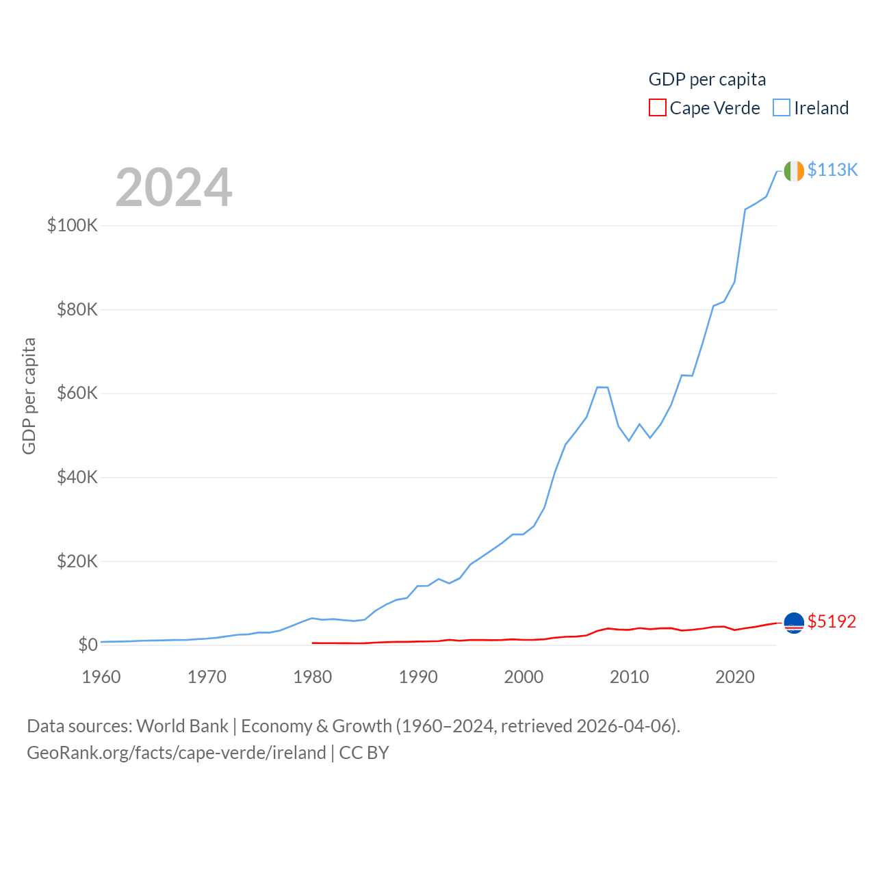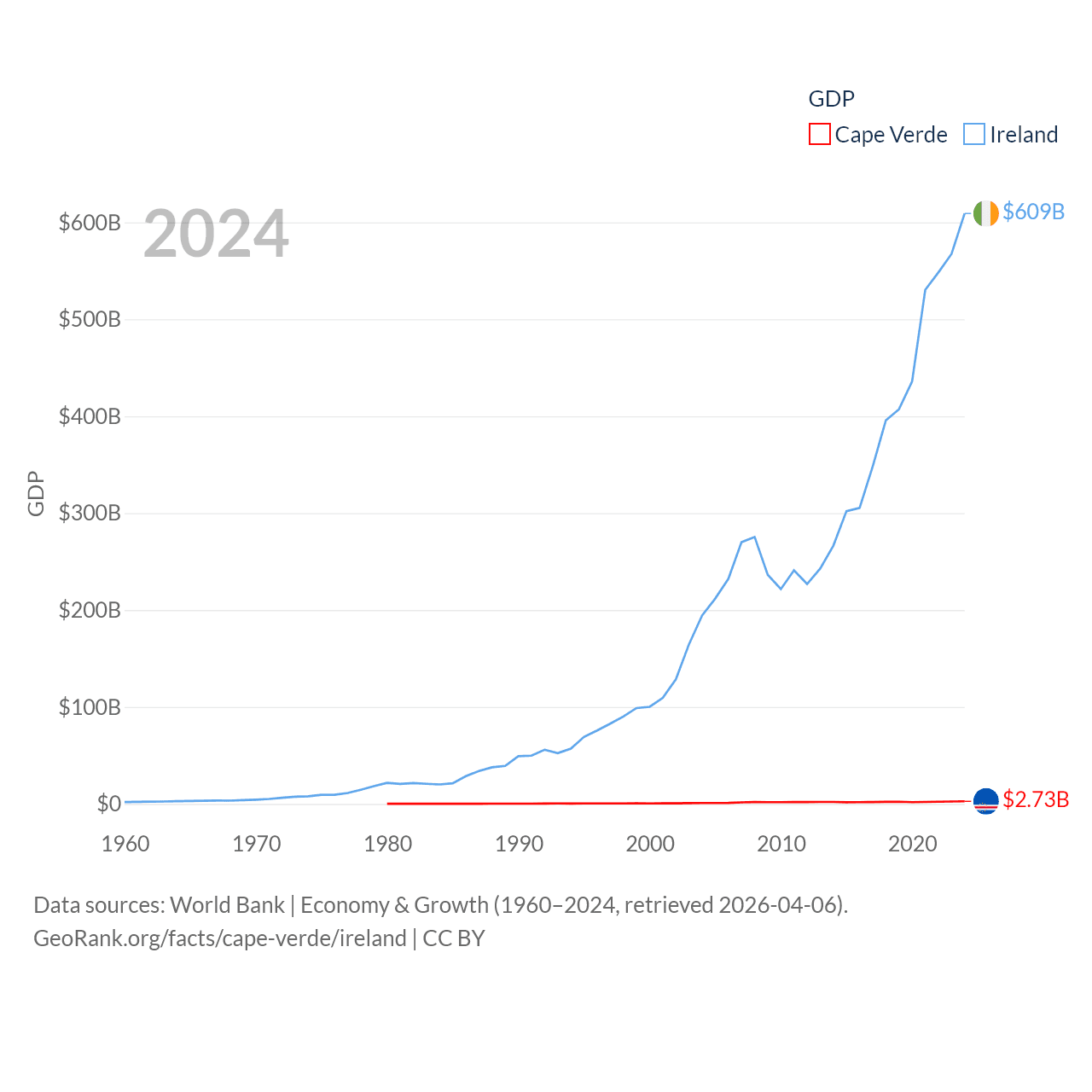 By GDP, Cape Verde ranks 172/197 ($2.73B) and Ireland ranks 25/197 ($609B). By GDP per capita, Cape Verde ranks 118/197 ($5,192), while Ireland ranks 4/197 ($112,895).
