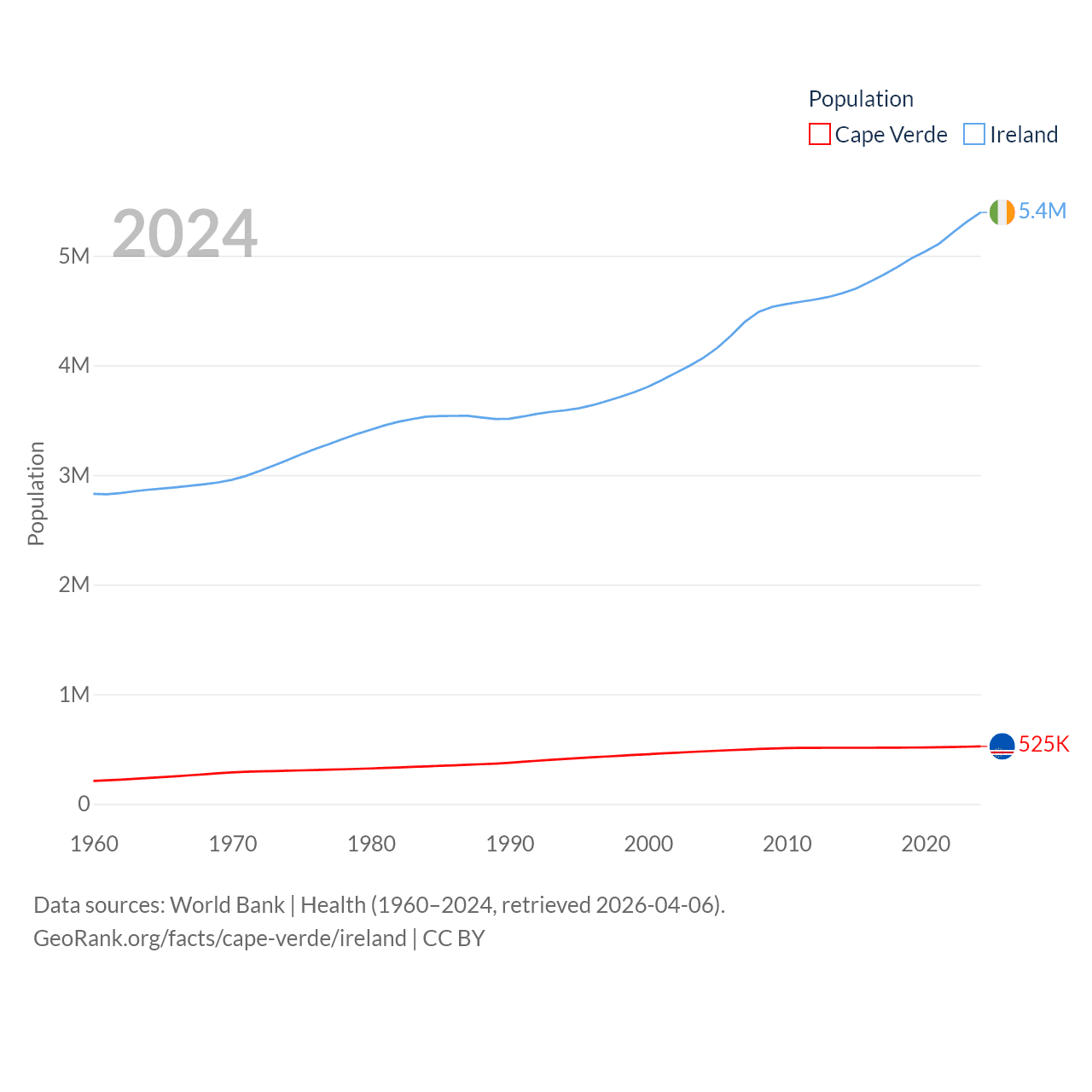 Cape Verde has a population of 525K (ranked 169/197), compared with 5.4M in Ireland (ranked 120/197). Cape Verde's land area is 1,556 sq mi versus 26,599 sq mi for Ireland (ranked 167th vs. 119th).