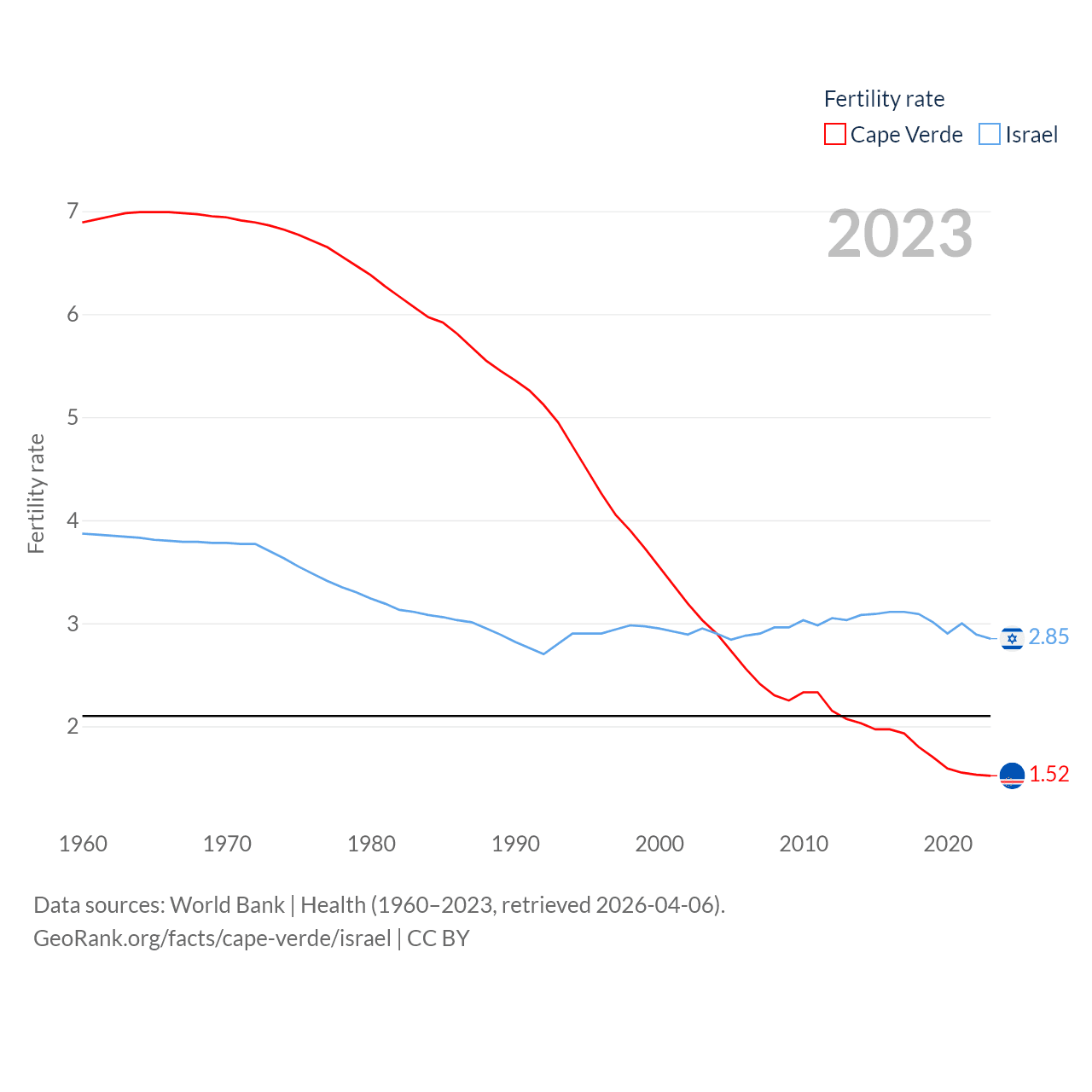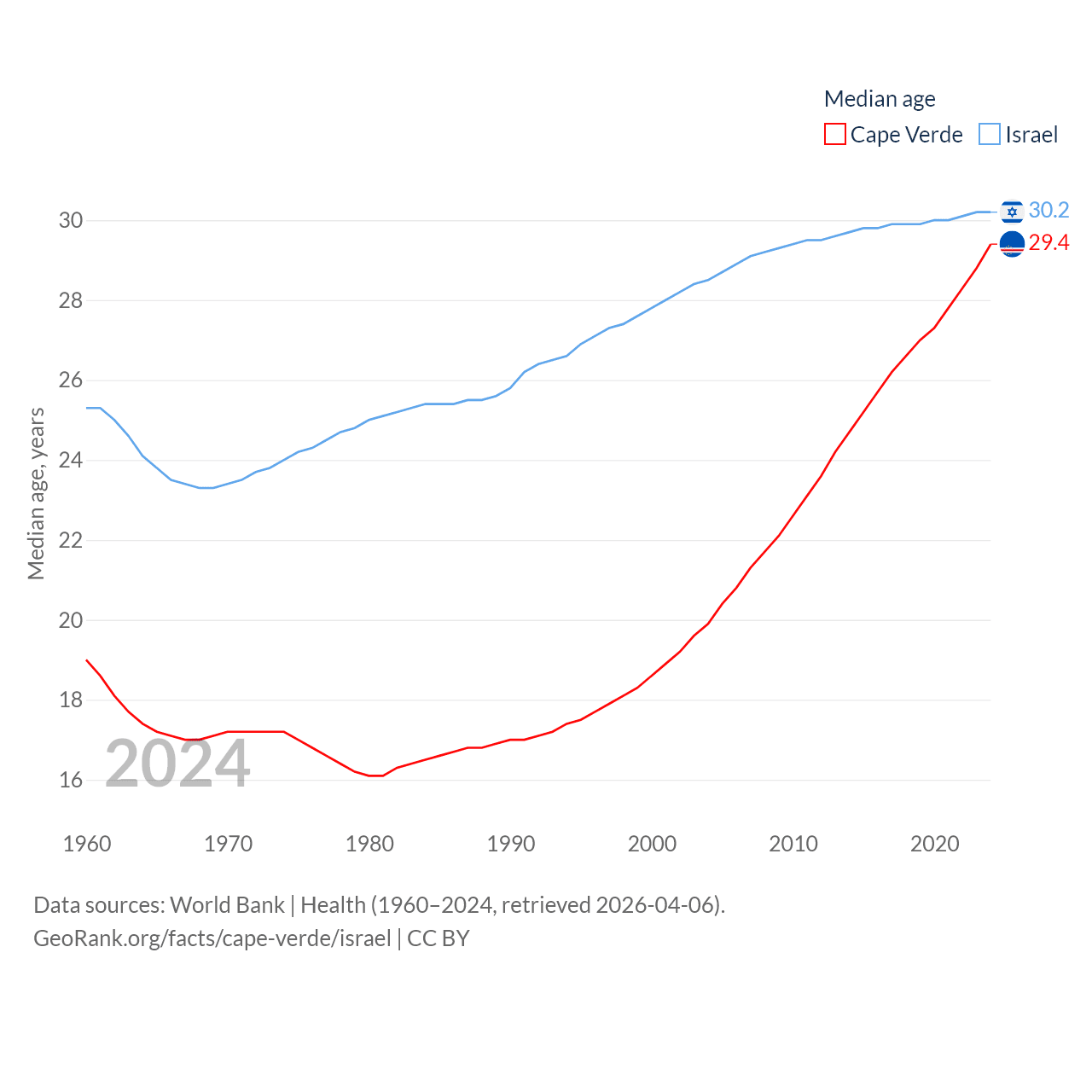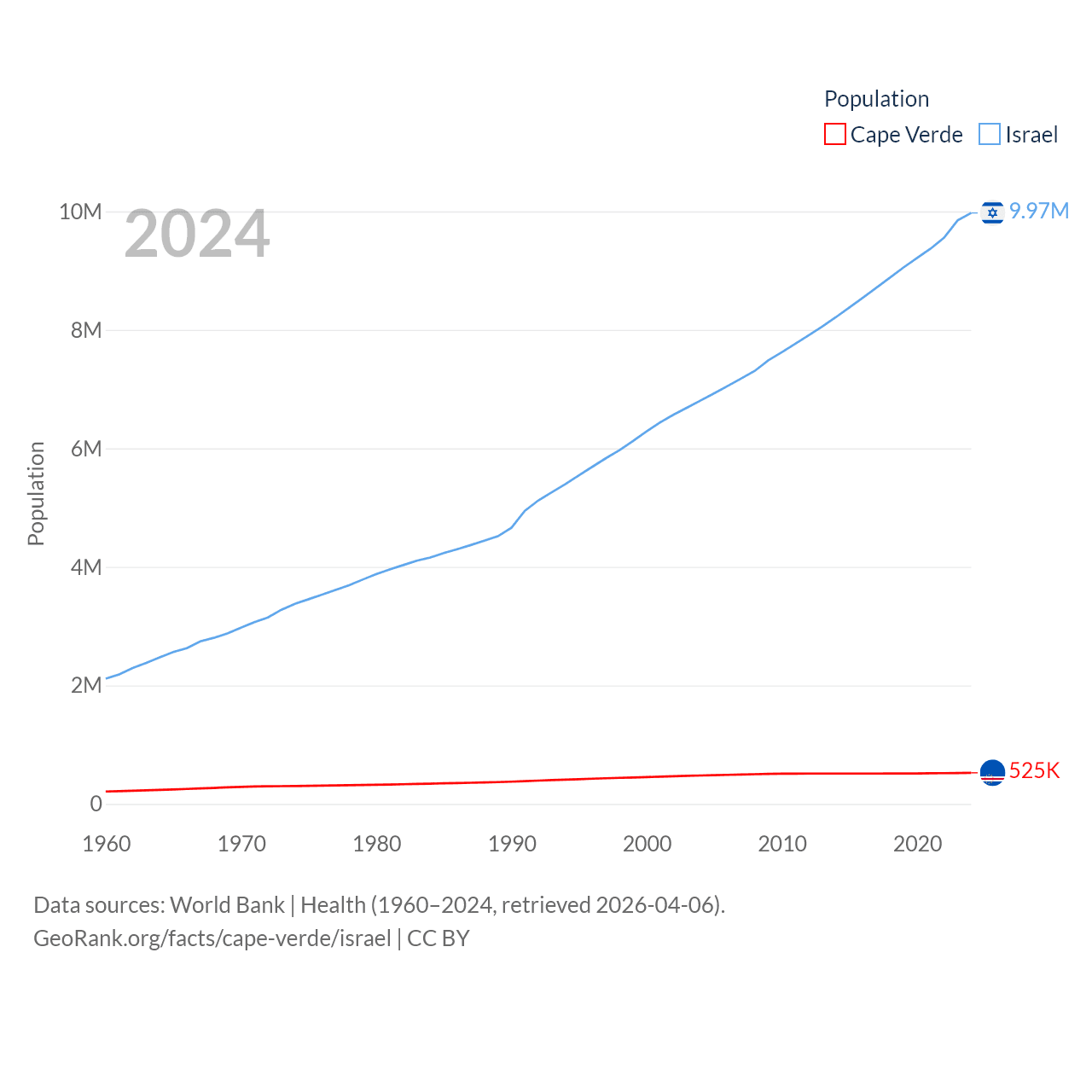 Cape Verde has a population of 525K (ranked 169/197), compared with 9.97M in Israel (ranked 96/197). Cape Verde's land area is 1,556 sq mi versus 8,355 sq mi for Israel (ranked 167th vs. 149th).