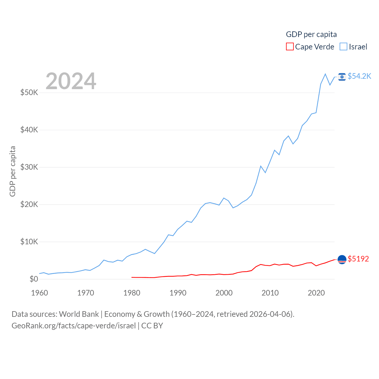 By GDP, Cape Verde ranks 172/197 ($2.73B) and Israel ranks 29/197 ($540B). By GDP per capita, Cape Verde ranks 118/197 ($5,192), while Israel ranks 21/197 ($54,177).