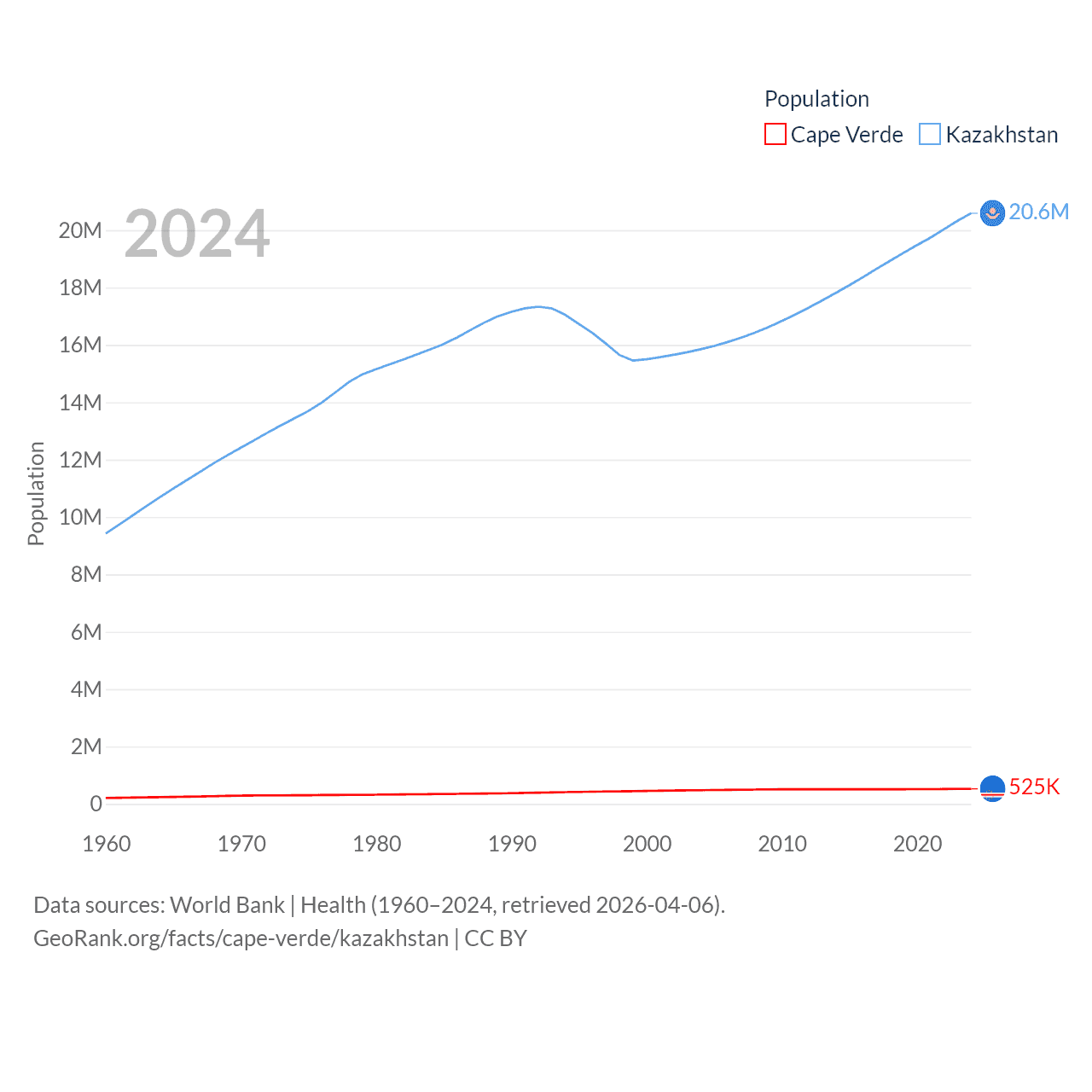 Cape Verde has a population of 525K (ranked 169/197), compared with 20.6M in Kazakhstan (ranked 64/197). Cape Verde's land area is 1,556 sq mi versus 1,042,360 sq mi for Kazakhstan (ranked 167th vs. 9th).