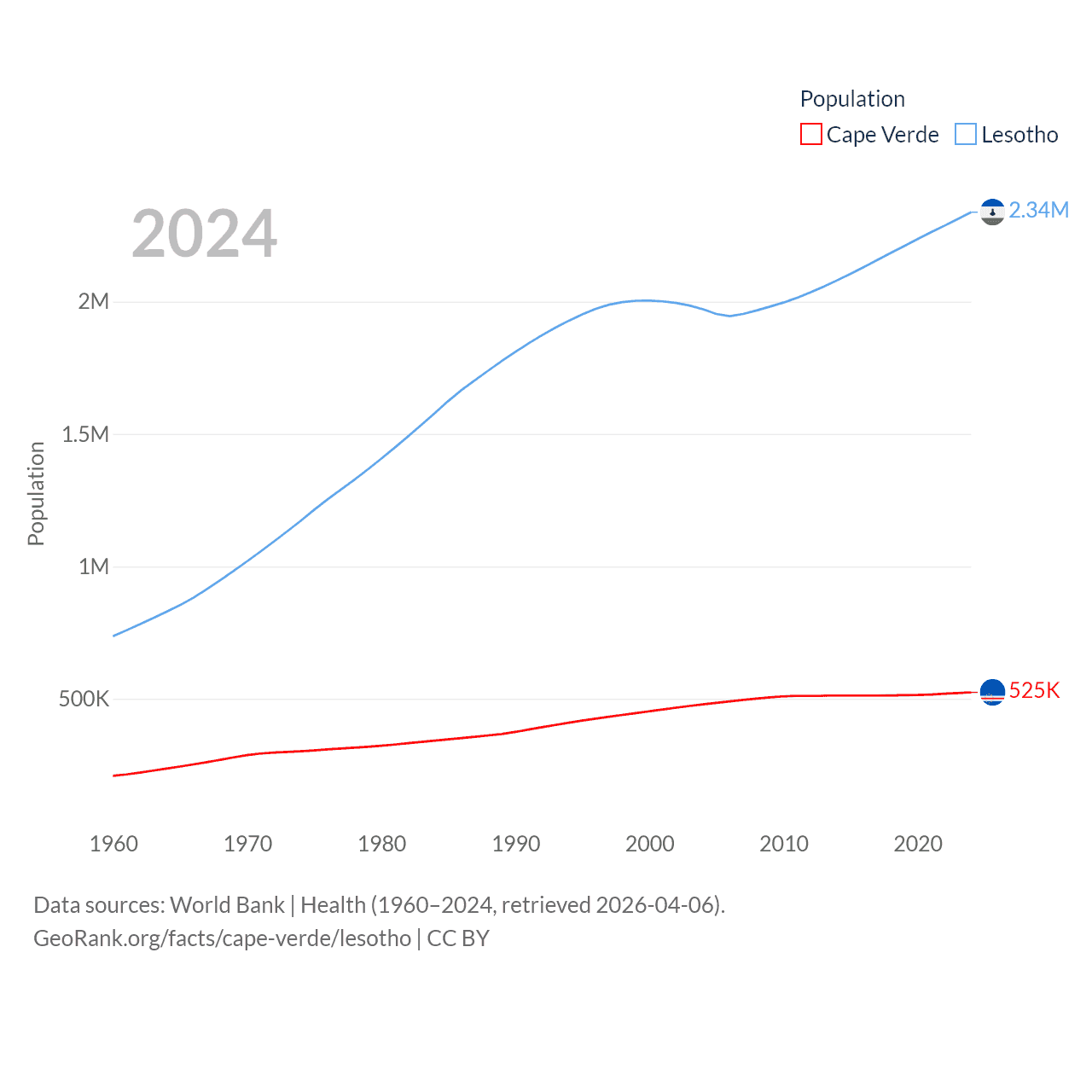 Cape Verde has a population of 525K (ranked 169/197), compared with 2.34M in Lesotho (ranked 145/197). Cape Verde's land area is 1,556 sq mi versus 11,722 sq mi for Lesotho (ranked 167th vs. 137th).