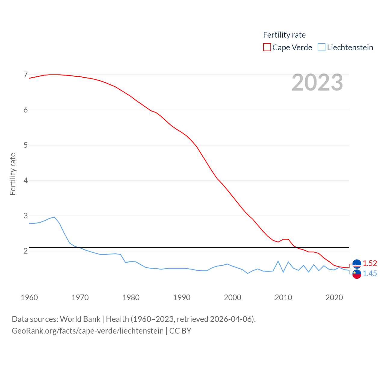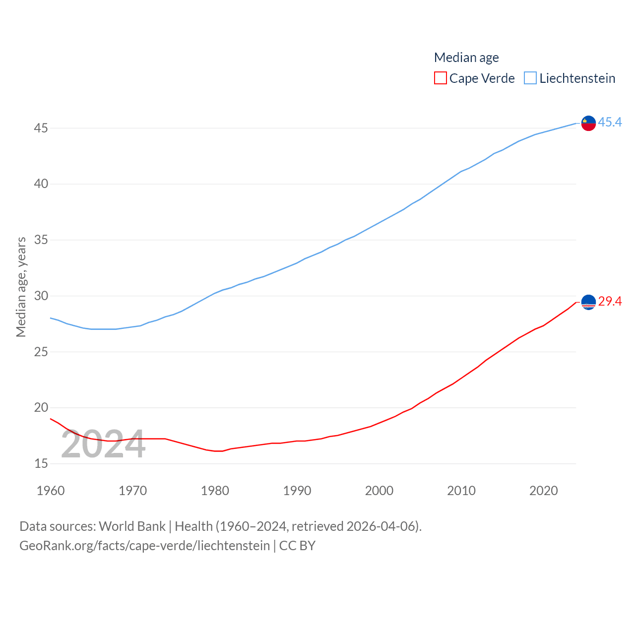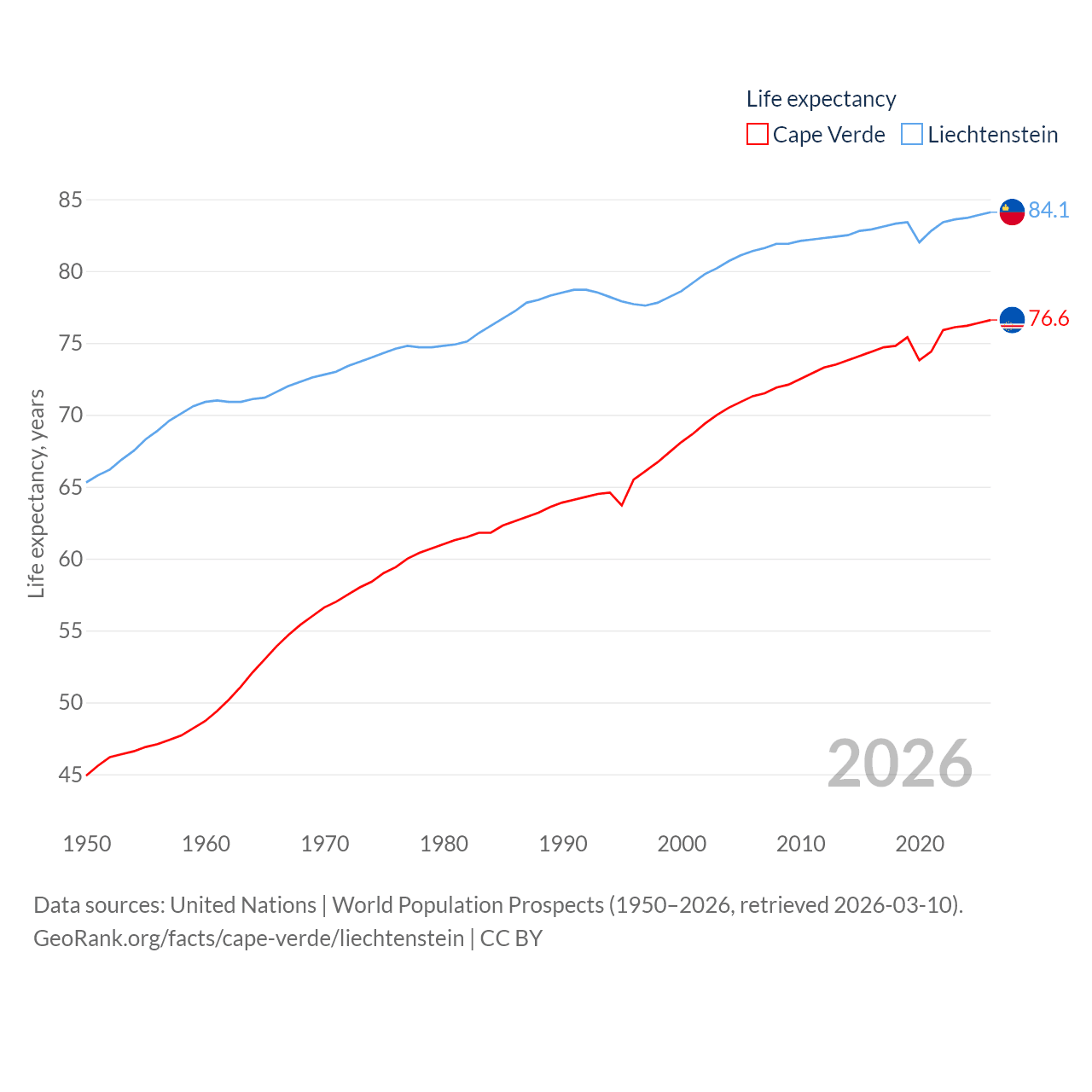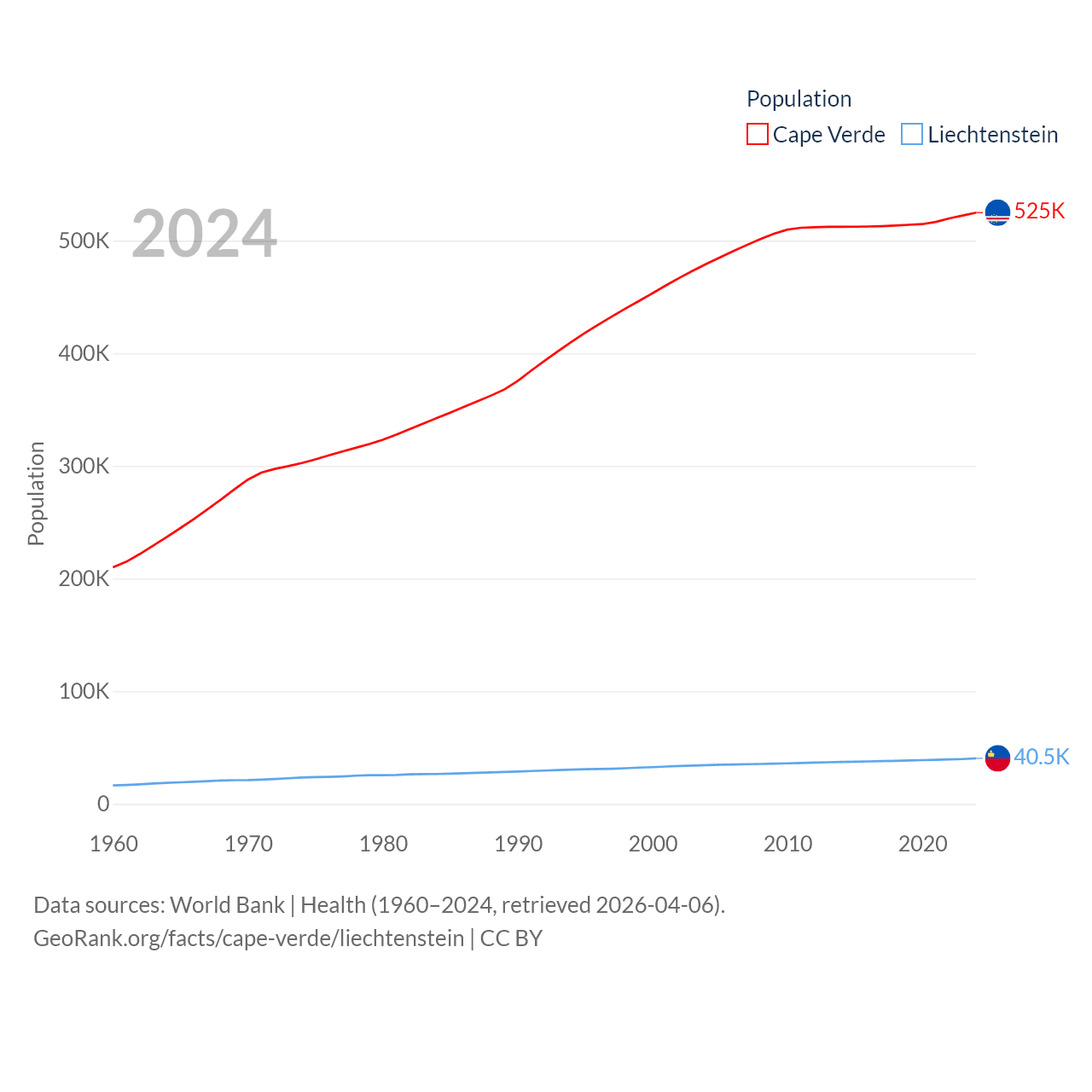 Cape Verde has a population of 525K (ranked 169/197), compared with 40.4K in Liechtenstein (ranked 190/197). Cape Verde's land area is 1,556 sq mi versus 61.8 sq mi for Liechtenstein (ranked 167th vs. 192nd).