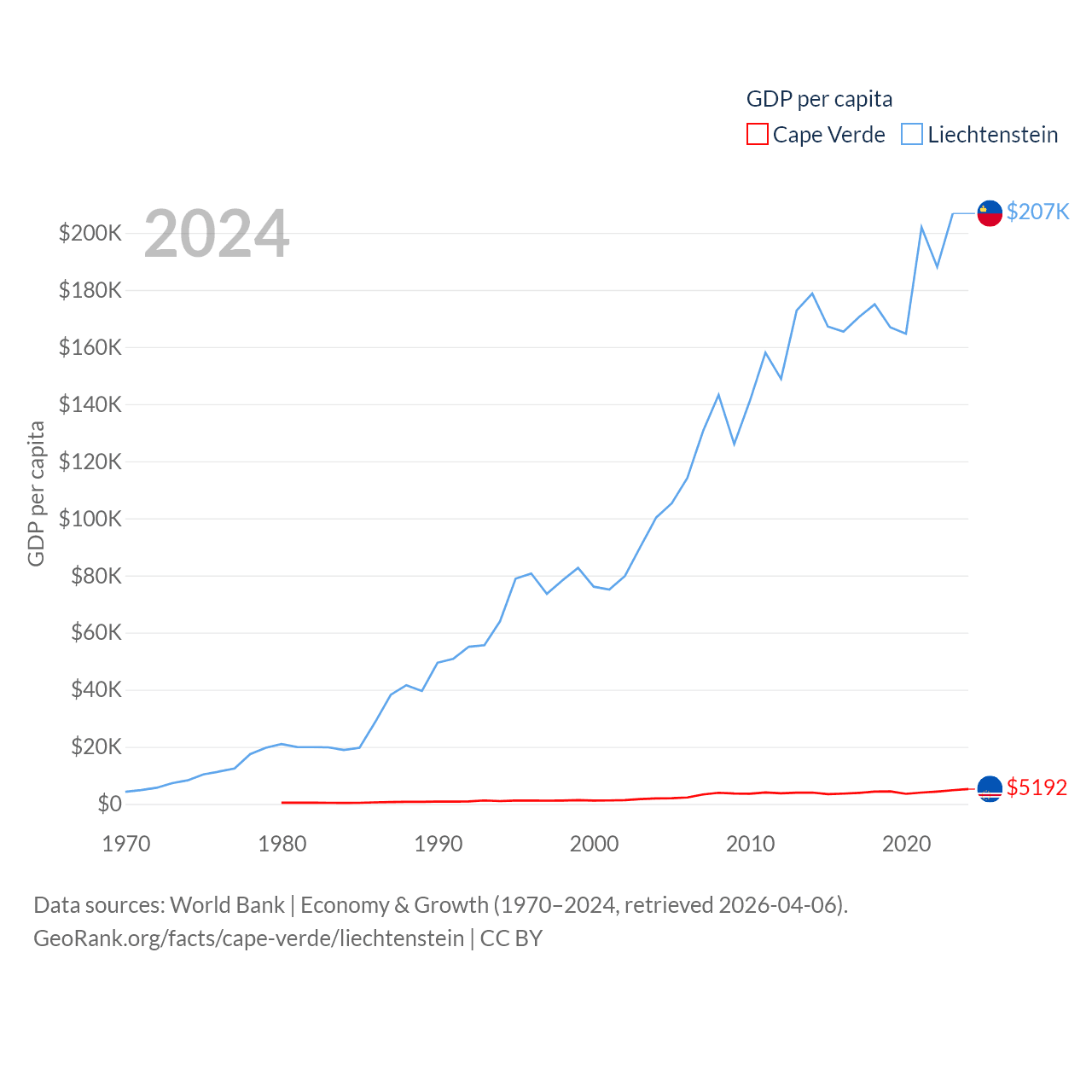 By GDP, Cape Verde ranks 172/197 ($2.73B) and Liechtenstein ranks 156/197 ($8.24B). By GDP per capita, Cape Verde ranks 118/197 ($5,192), while Liechtenstein ranks 2/197 ($206,781).