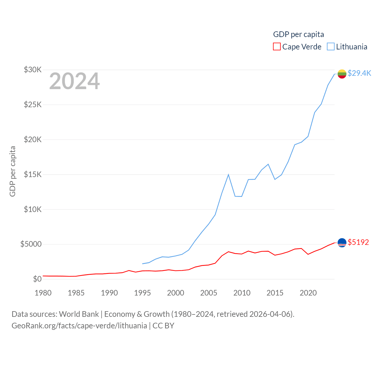 By GDP, Cape Verde ranks 172/197 ($2.73B) and Lithuania ranks 79/197 ($84.9B). By GDP per capita, Cape Verde ranks 118/197 ($5,192), while Lithuania ranks 43/197 ($29,384).