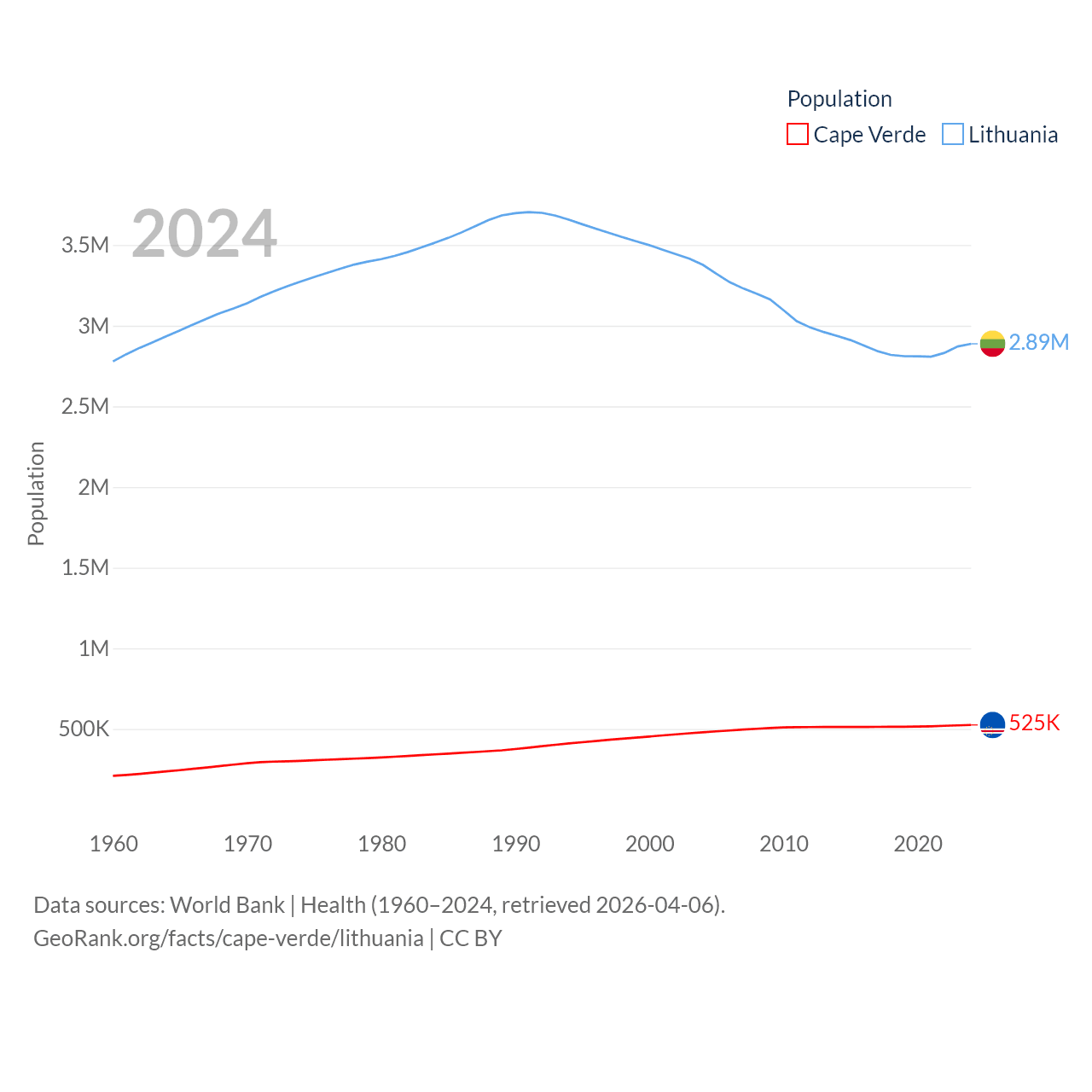 Cape Verde has a population of 525K (ranked 169/197), compared with 2.89M in Lithuania (ranked 137/197). Cape Verde's land area is 1,556 sq mi versus 24,170 sq mi for Lithuania (ranked 167th vs. 120th).
