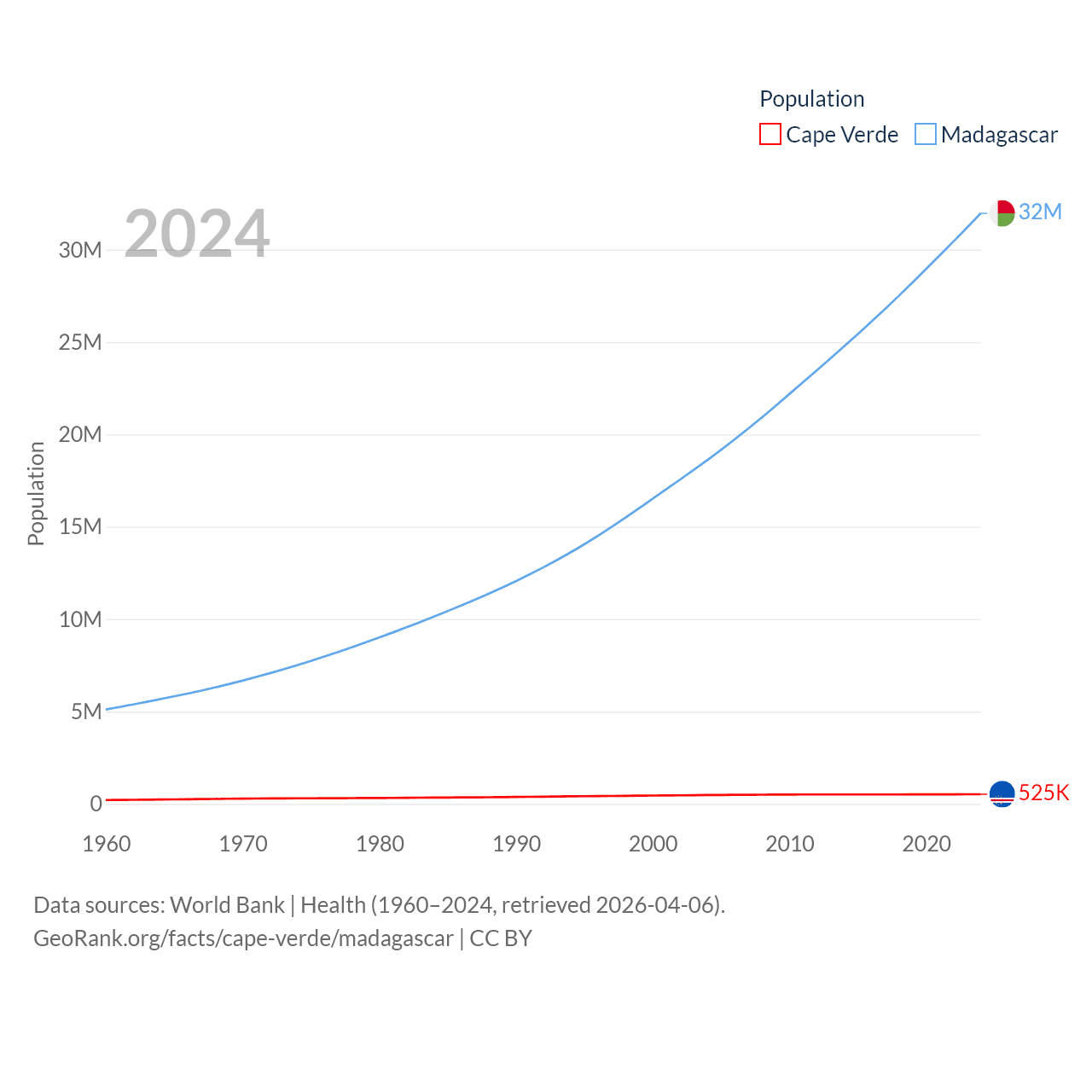 Cape Verde has a population of 525K (ranked 169/197), compared with 32M in Madagascar (ranked 49/197). Cape Verde's land area is 1,556 sq mi versus 224,634 sq mi for Madagascar (ranked 167th vs. 44th).