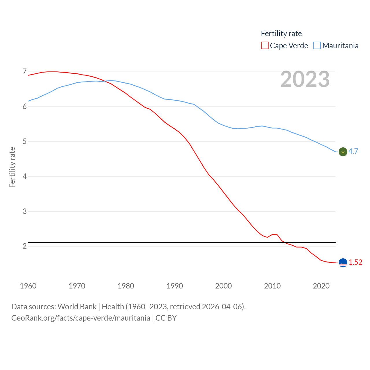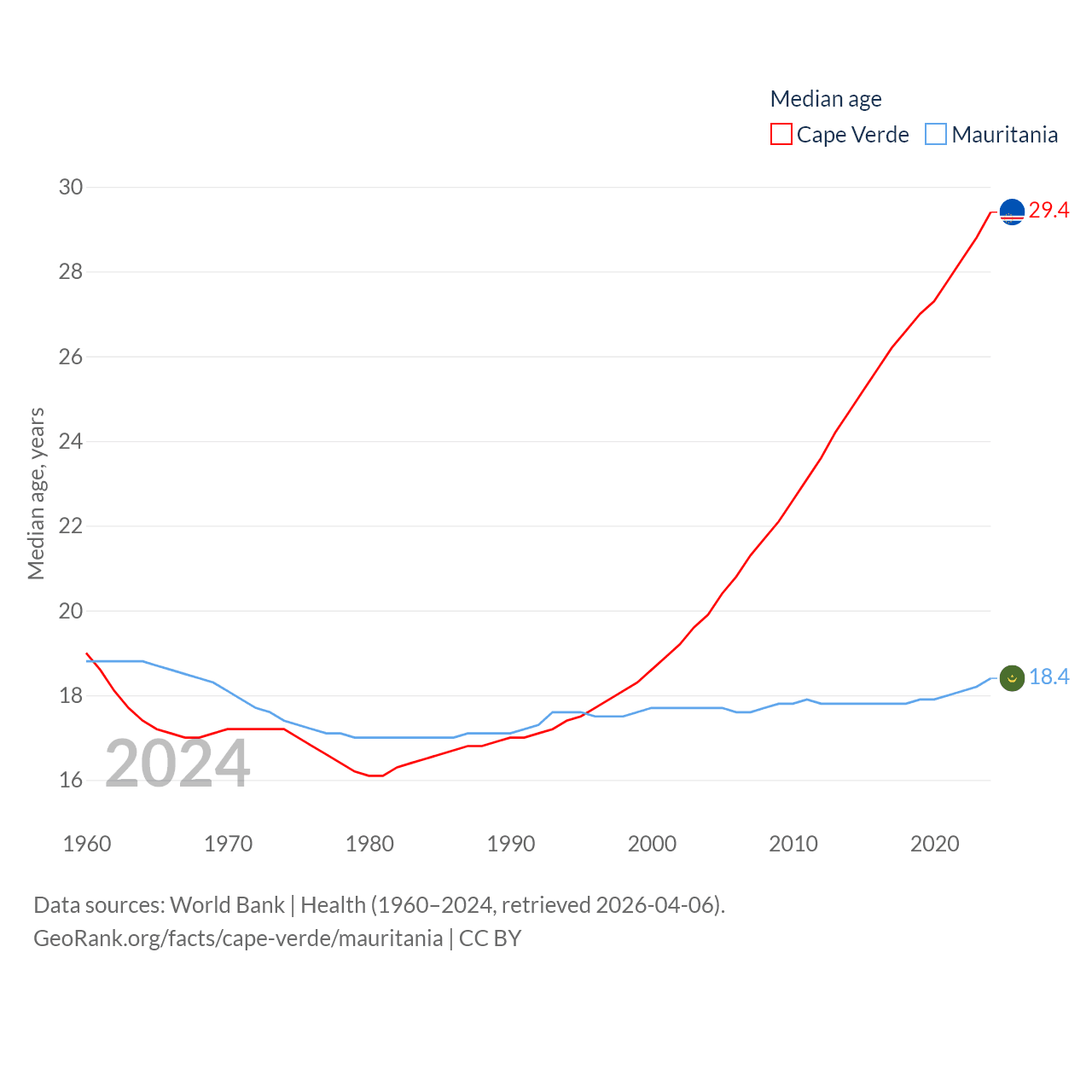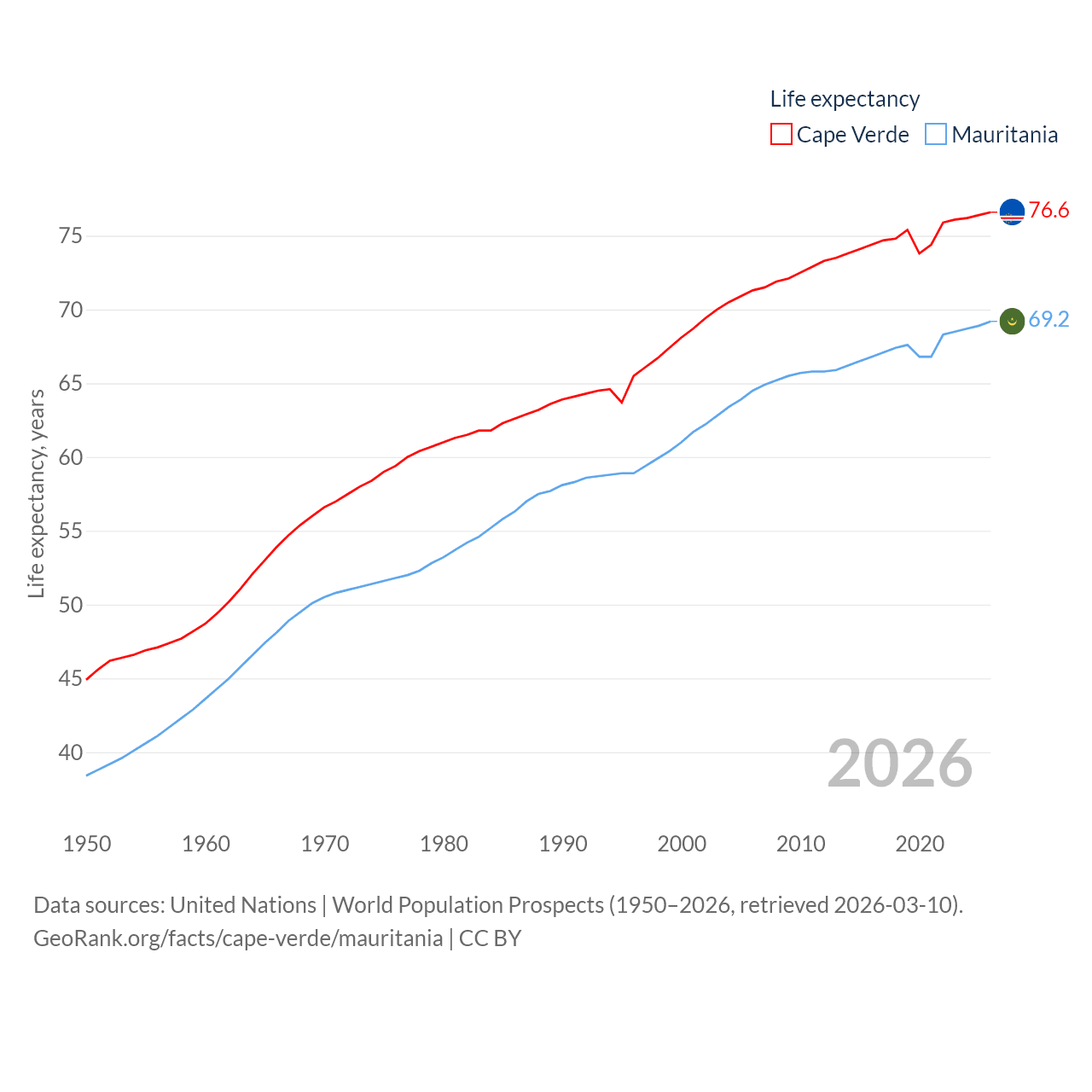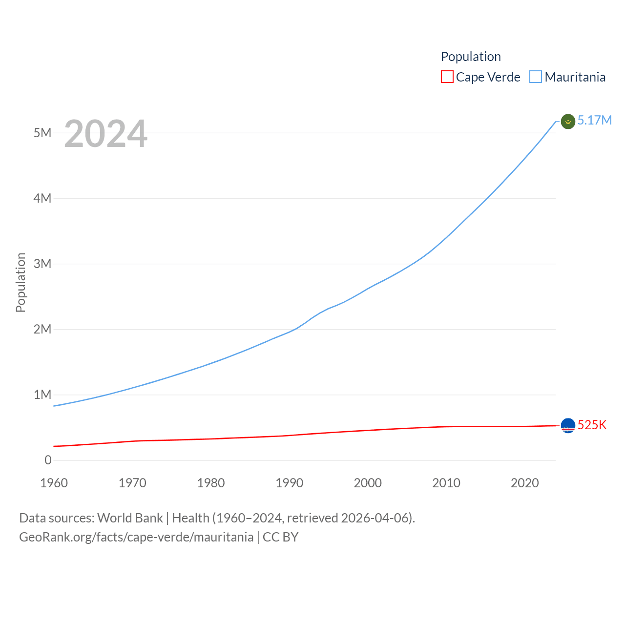 Cape Verde has a population of 525K (ranked 169/197), compared with 5.17M in Mauritania (ranked 125/197). Cape Verde's land area is 1,556 sq mi versus 397,955 sq mi for Mauritania (ranked 167th vs. 28th).