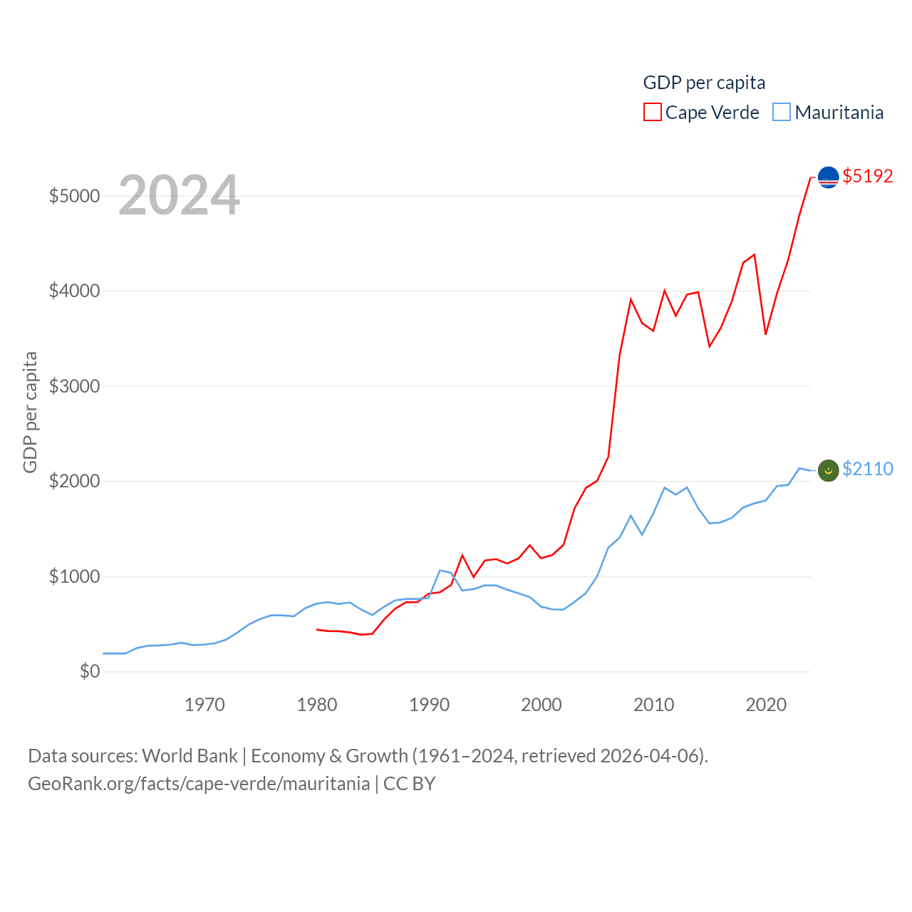 By GDP, Cape Verde ranks 172/197 ($2.73B) and Mauritania ranks 153/197 ($10.9B). By GDP per capita, Cape Verde ranks 118/197 ($5,192), while Mauritania ranks 156/197 ($2,110).