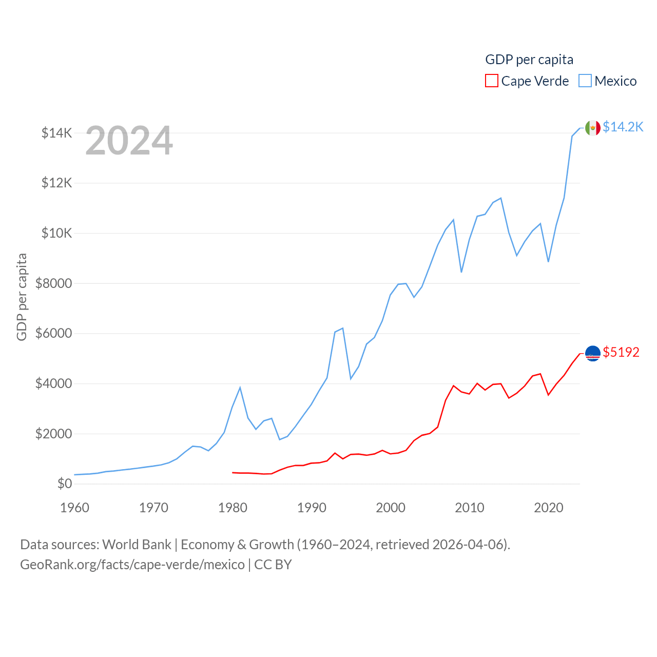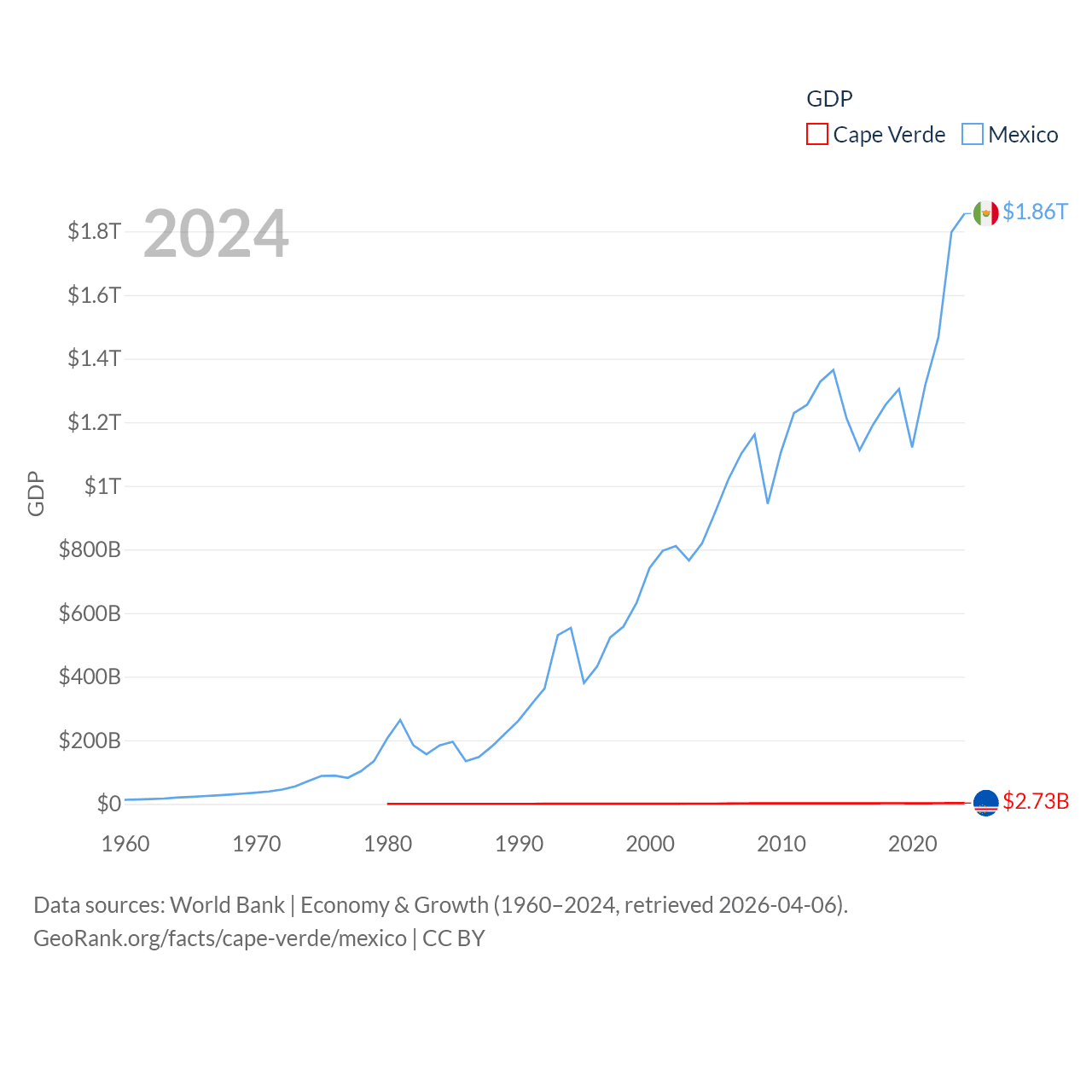 By GDP, Cape Verde ranks 172/197 ($2.73B) and Mexico ranks 13/197 ($1.86T). By GDP per capita, Cape Verde ranks 118/197 ($5,192), while Mexico ranks 69/197 ($14,186).