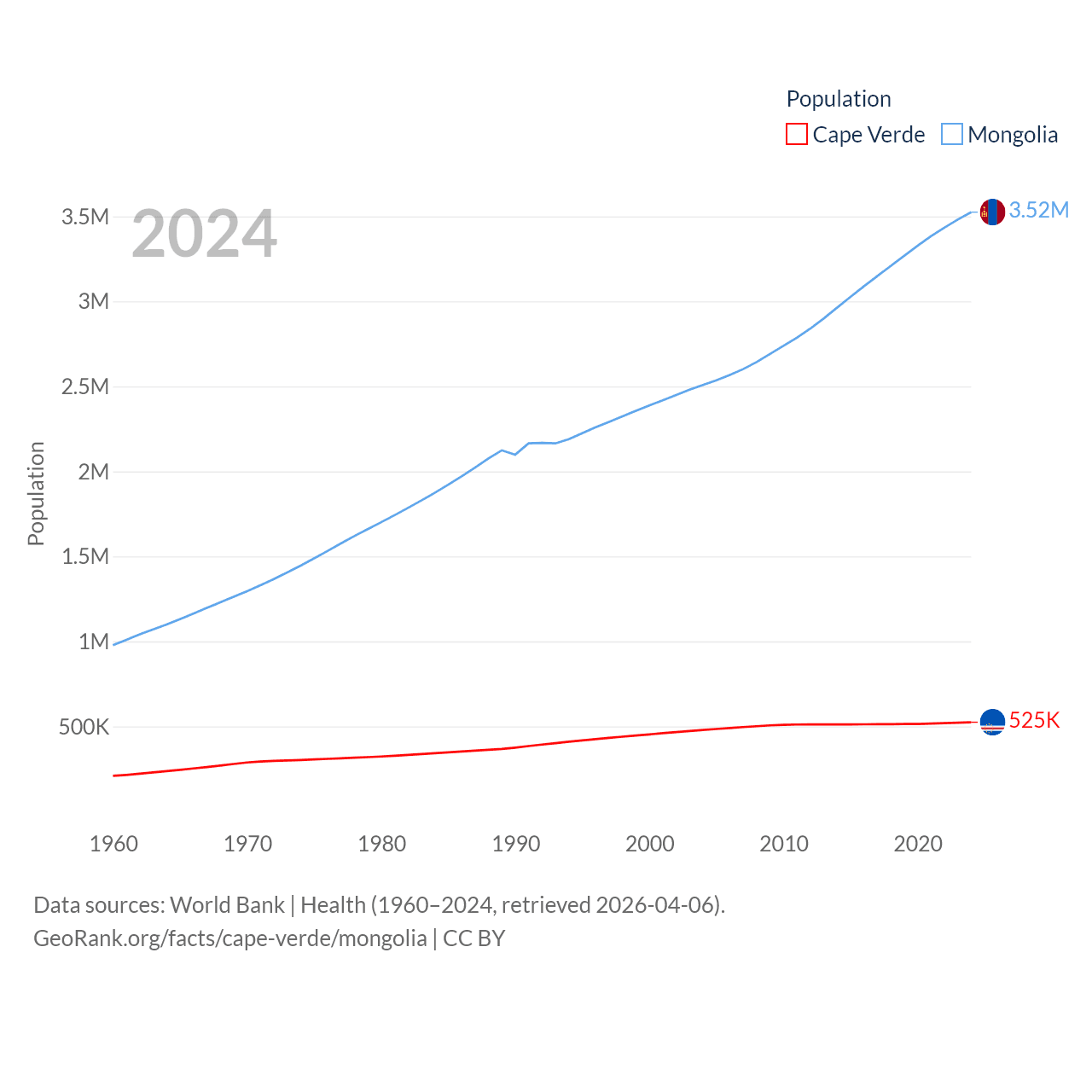 Cape Verde has a population of 525K (ranked 169/197), compared with 3.52M in Mongolia (ranked 132/197). Cape Verde's land area is 1,556 sq mi versus 601,740 sq mi for Mongolia (ranked 167th vs. 18th).