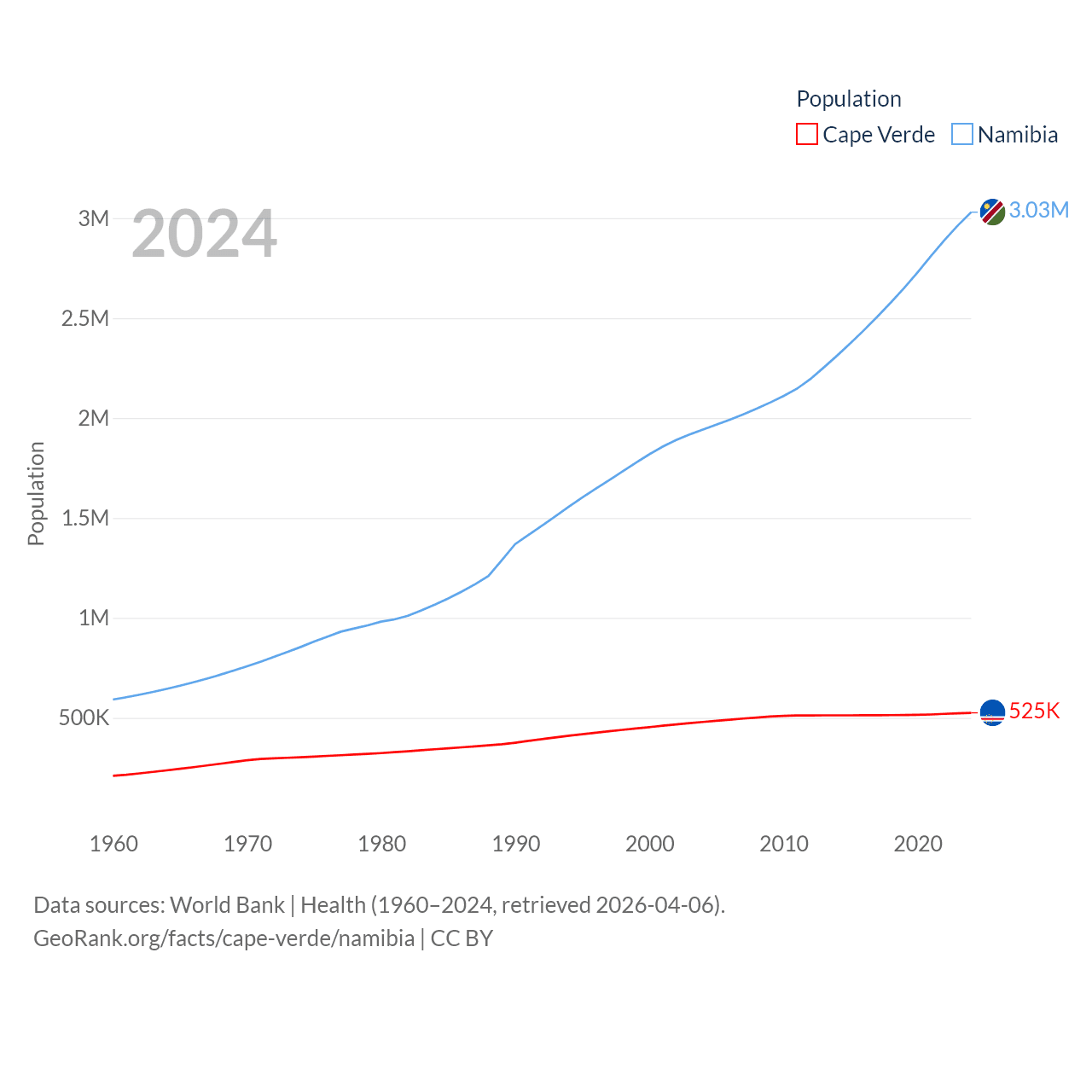 Cape Verde has a population of 525K (ranked 169/197), compared with 3.03M in Namibia (ranked 136/197). Cape Verde's land area is 1,556 sq mi versus 317,874 sq mi for Namibia (ranked 167th vs. 33rd).