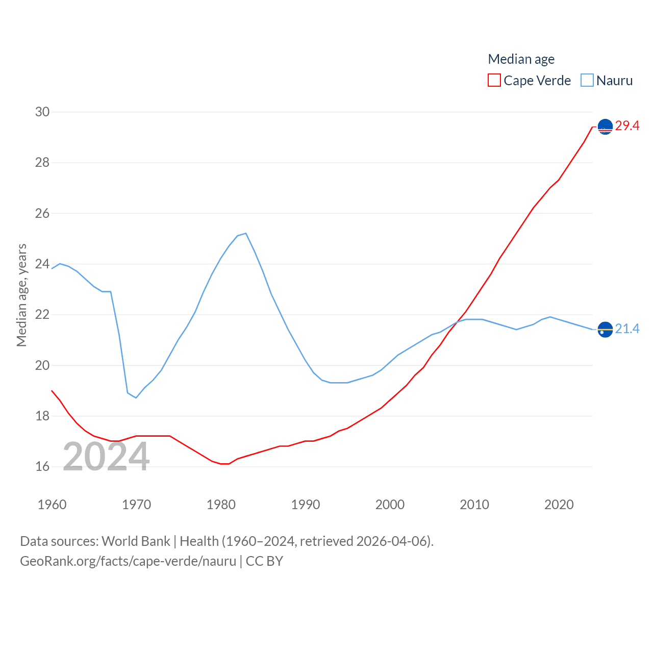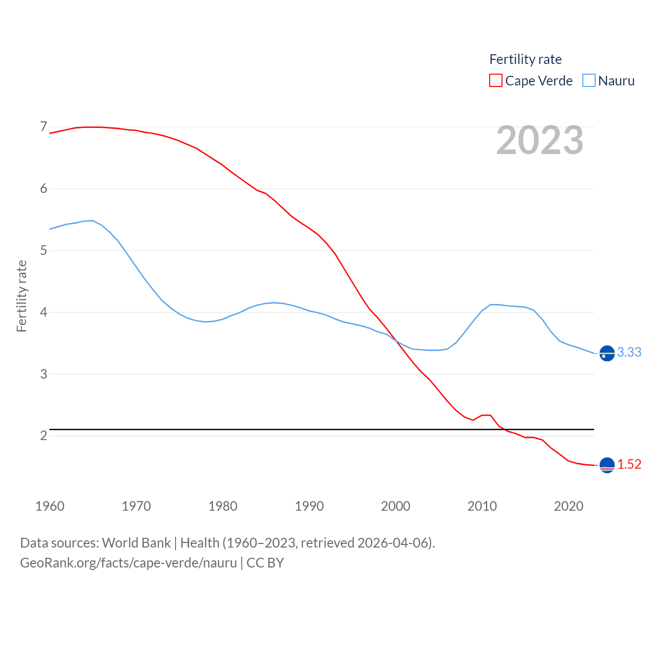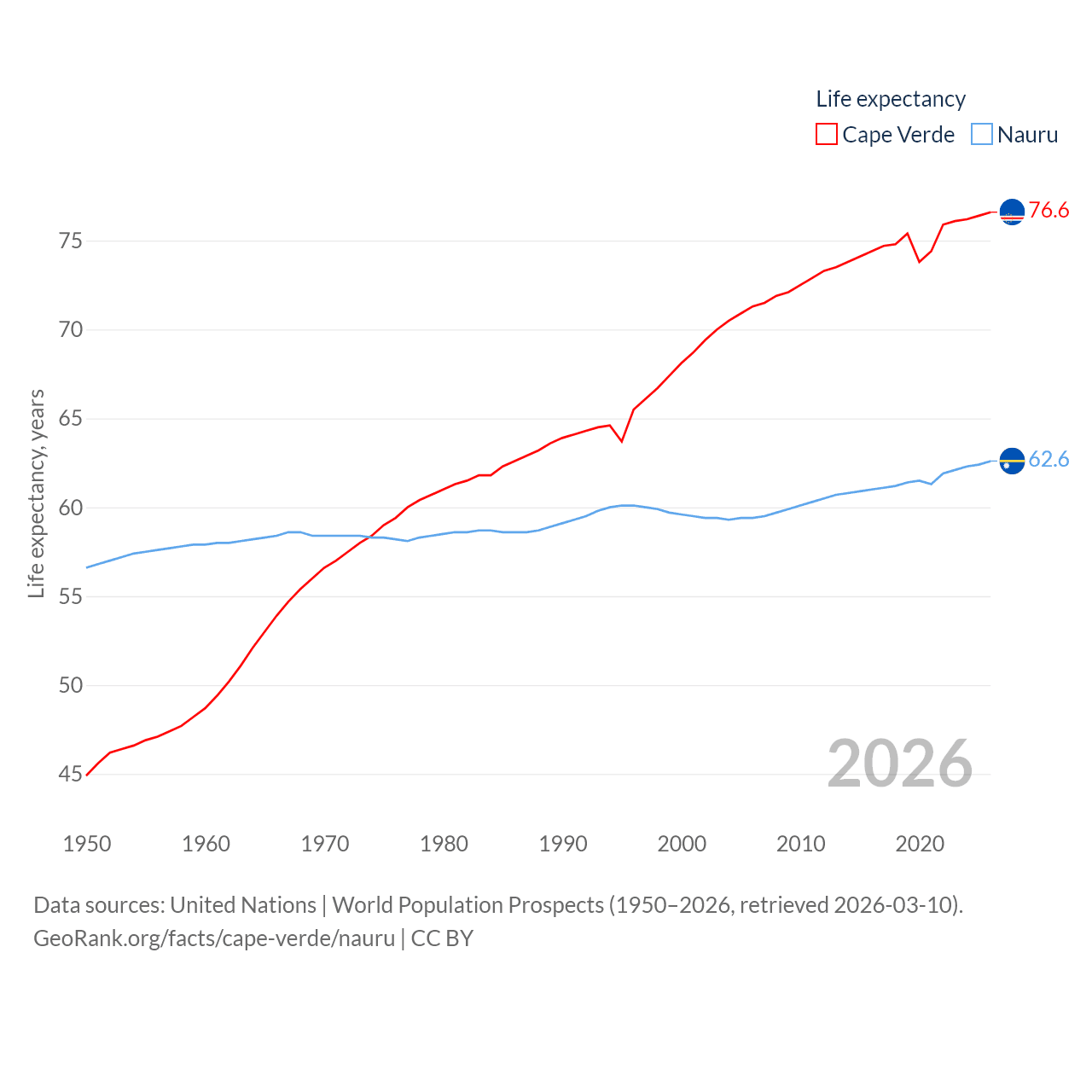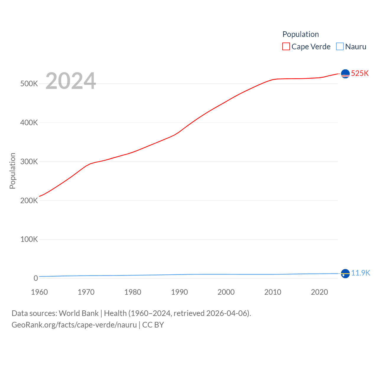 Cape Verde has a population of 525K (ranked 169/197), compared with 11.9K in Nauru (ranked 195/197). Cape Verde's land area is 1,556 sq mi versus 7.72 sq mi for Nauru (ranked 167th vs. 195th).