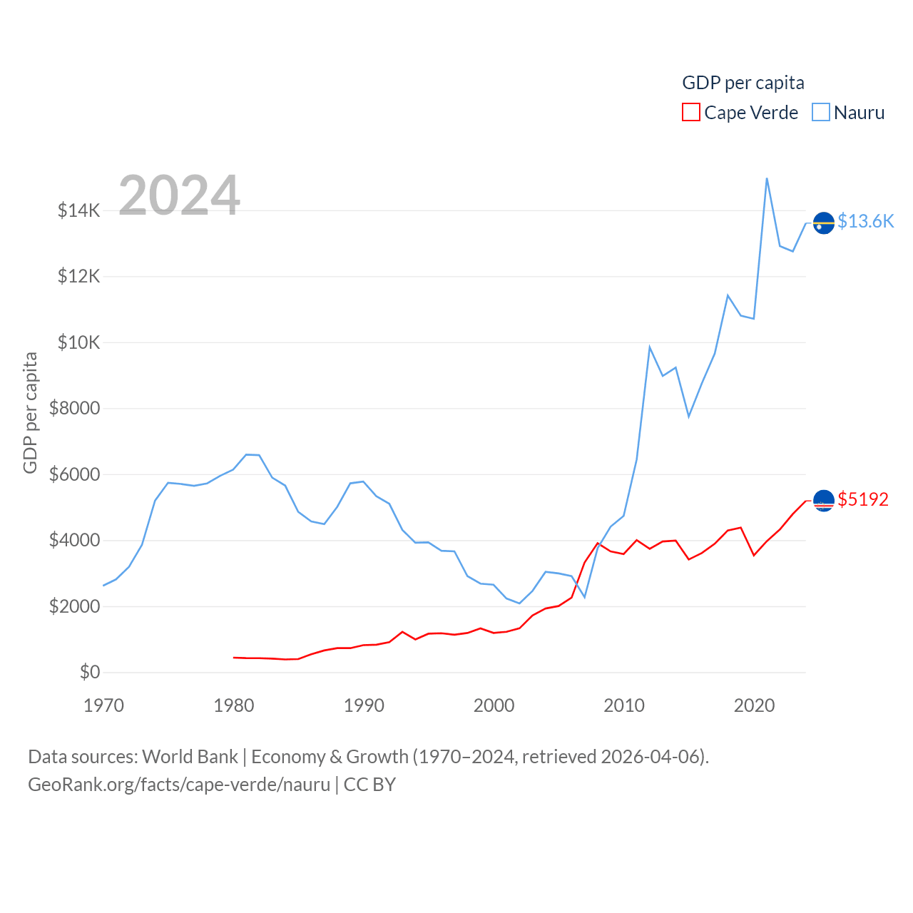 By GDP, Cape Verde ranks 172/197 ($2.73B) and Nauru ranks 195/197 ($163M). By GDP per capita, Cape Verde ranks 118/197 ($5,192), while Nauru ranks 74/197 ($13,609).