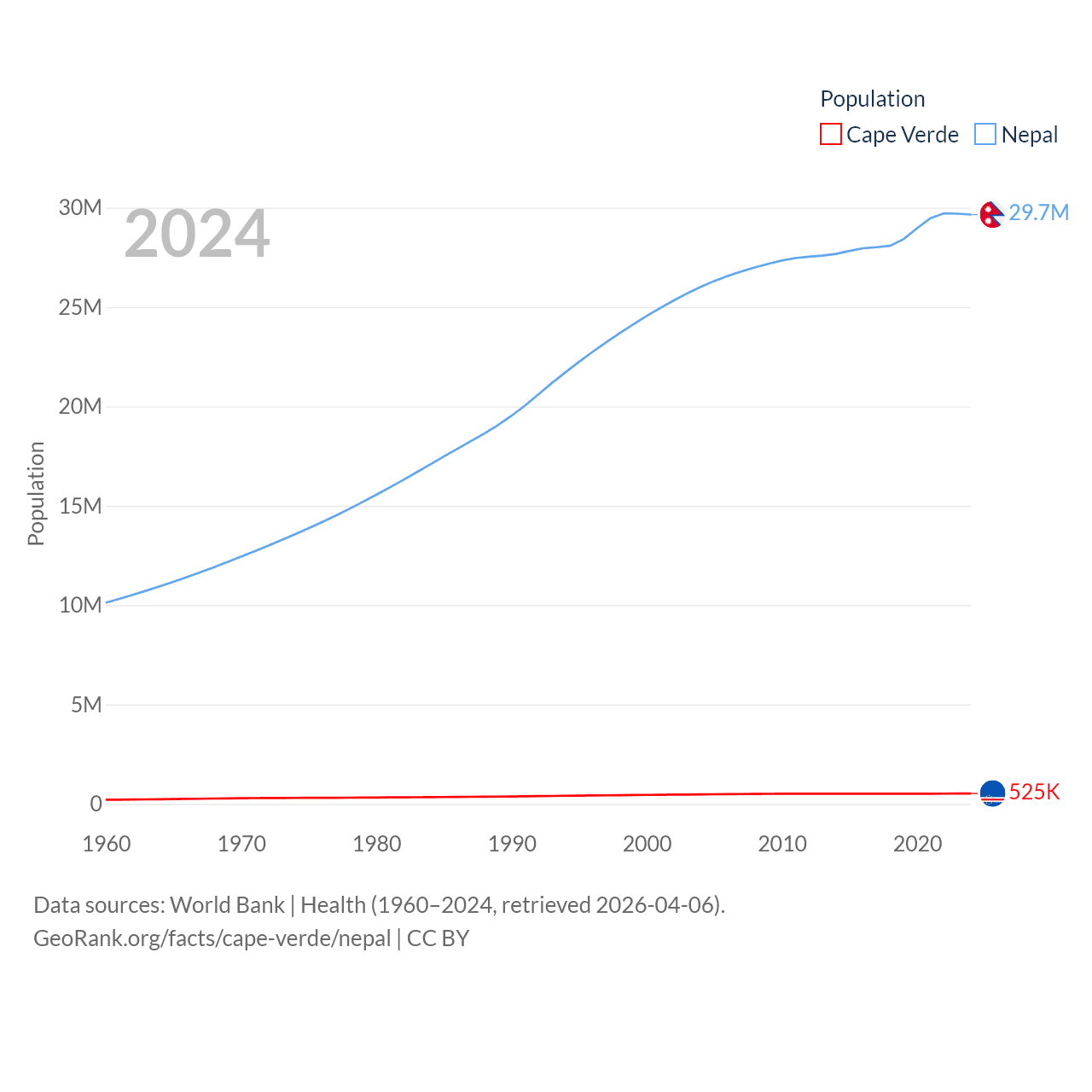 Cape Verde has a population of 525K (ranked 169/197), compared with 29.7M in Nepal (ranked 51/197). Cape Verde's land area is 1,556 sq mi versus 55,348 sq mi for Nepal (ranked 167th vs. 92nd).