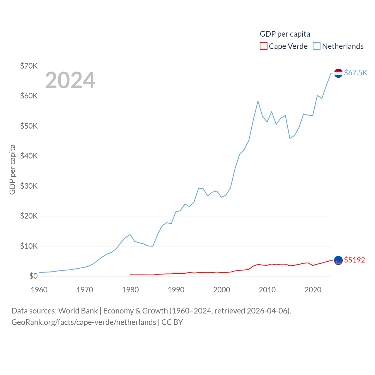 By GDP, Cape Verde ranks 172/197 ($2.73B) and The Netherlands ranks 19/197 ($1.21T). By GDP per capita, Cape Verde ranks 118/197 ($5,192), while The Netherlands ranks 13/197 ($67,520).