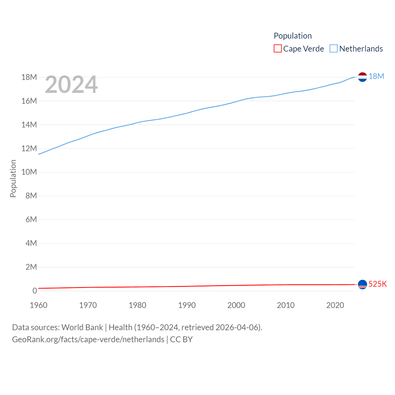 Cape Verde has a population of 525K (ranked 169/197), compared with 18M in The Netherlands (ranked 72/197). Cape Verde's land area is 1,556 sq mi versus 13,000 sq mi for The Netherlands (ranked 167th vs. 134th).