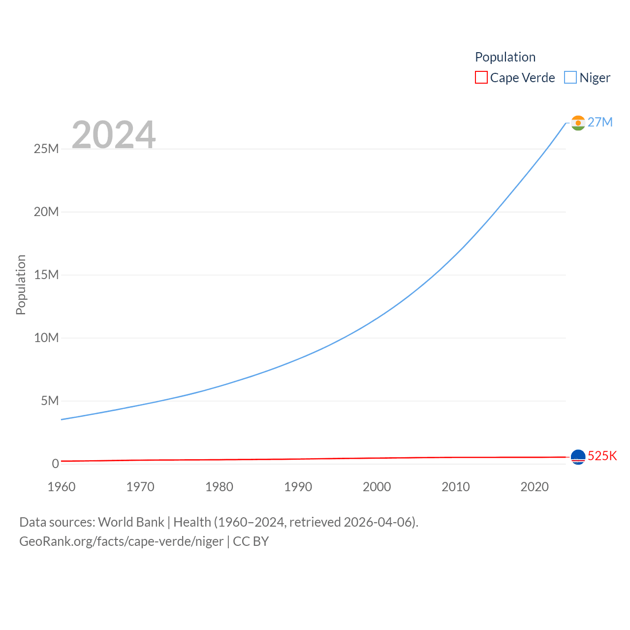 Cape Verde has a population of 525K (ranked 169/197), compared with 27M in Niger (ranked 55/197). Cape Verde's land area is 1,556 sq mi versus 489,076 sq mi for Niger (ranked 167th vs. 20th).