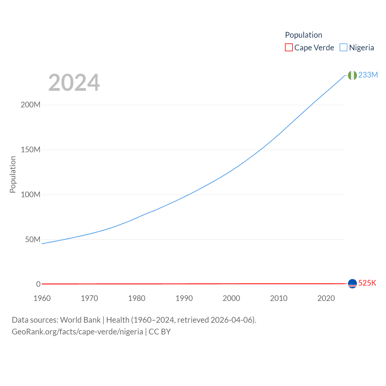 Cape Verde has a population of 525K (ranked 169/197), compared with 233M in Nigeria (ranked 6/197). Cape Verde's land area is 1,556 sq mi versus 351,650 sq mi for Nigeria (ranked 167th vs. 30th).