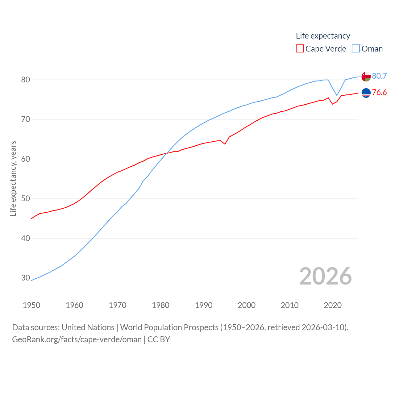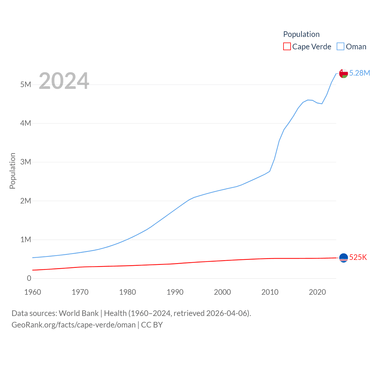 Cape Verde has a population of 525K (ranked 169/197), compared with 5.28M in Oman (ranked 124/197). Cape Verde's land area is 1,556 sq mi versus 119,499 sq mi for Oman (ranked 167th vs. 68th).