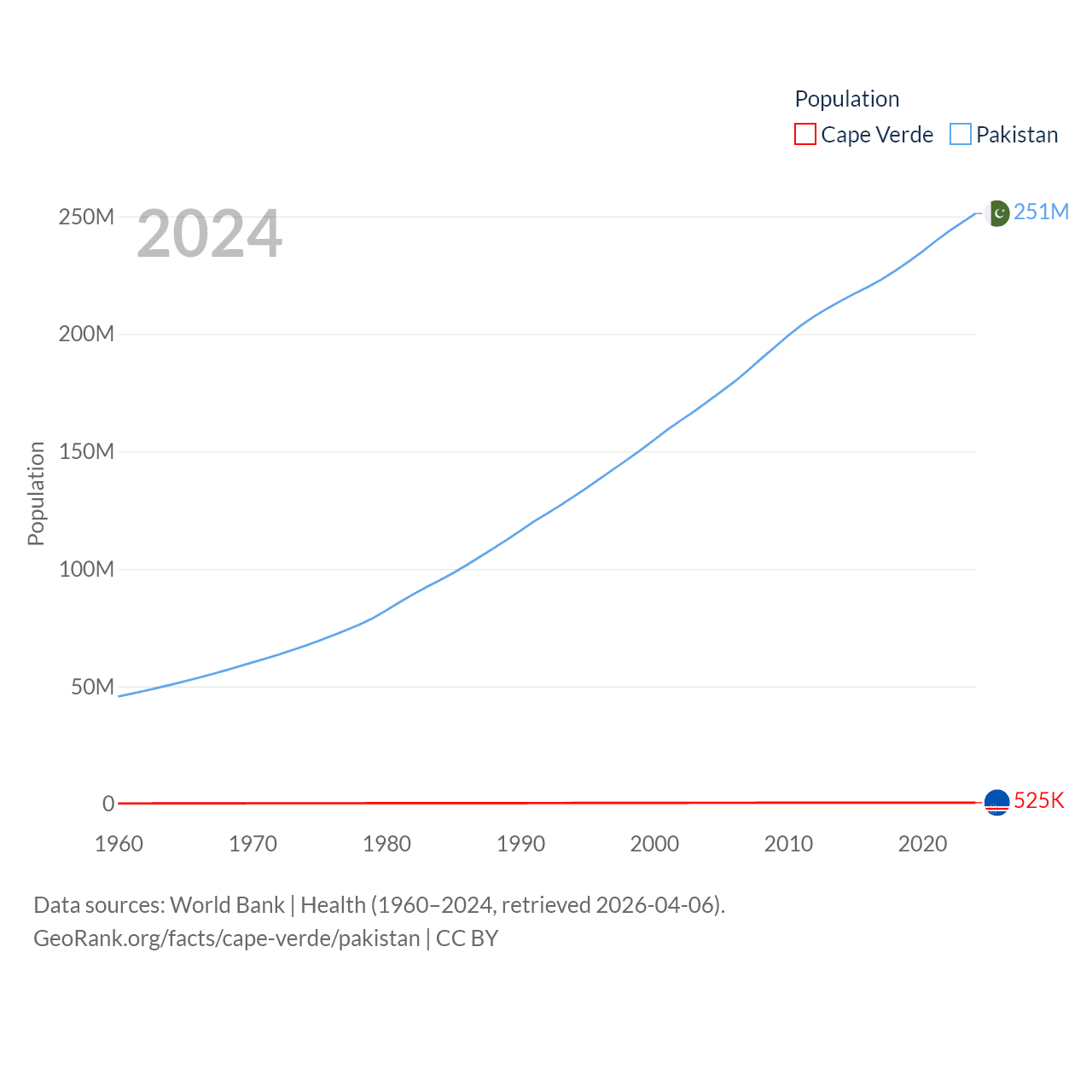 Cape Verde has a population of 525K (ranked 169/197), compared with 251M in Pakistan (ranked 5/197). Cape Verde's land area is 1,556 sq mi versus 297,638 sq mi for Pakistan (ranked 167th vs. 35th).