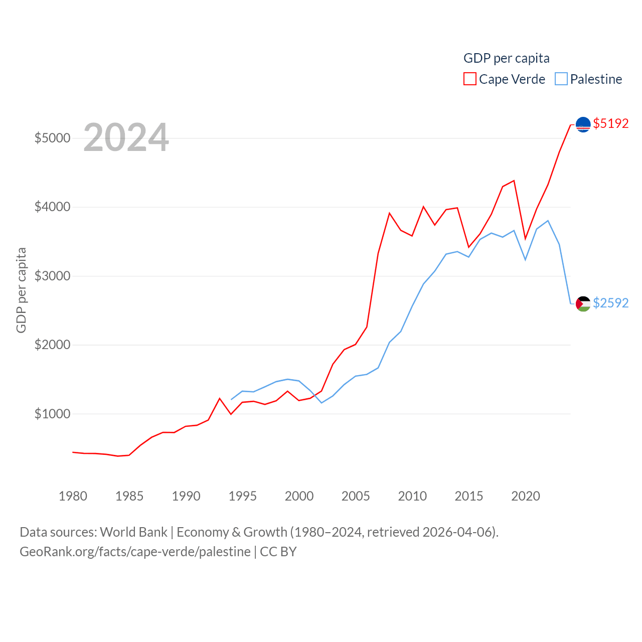 By GDP, Cape Verde ranks 172/197 ($2.73B) and Palestine ranks 146/197 ($13.7B). By GDP per capita, Cape Verde ranks 118/197 ($5,192), while Palestine ranks 147/197 ($2,592).