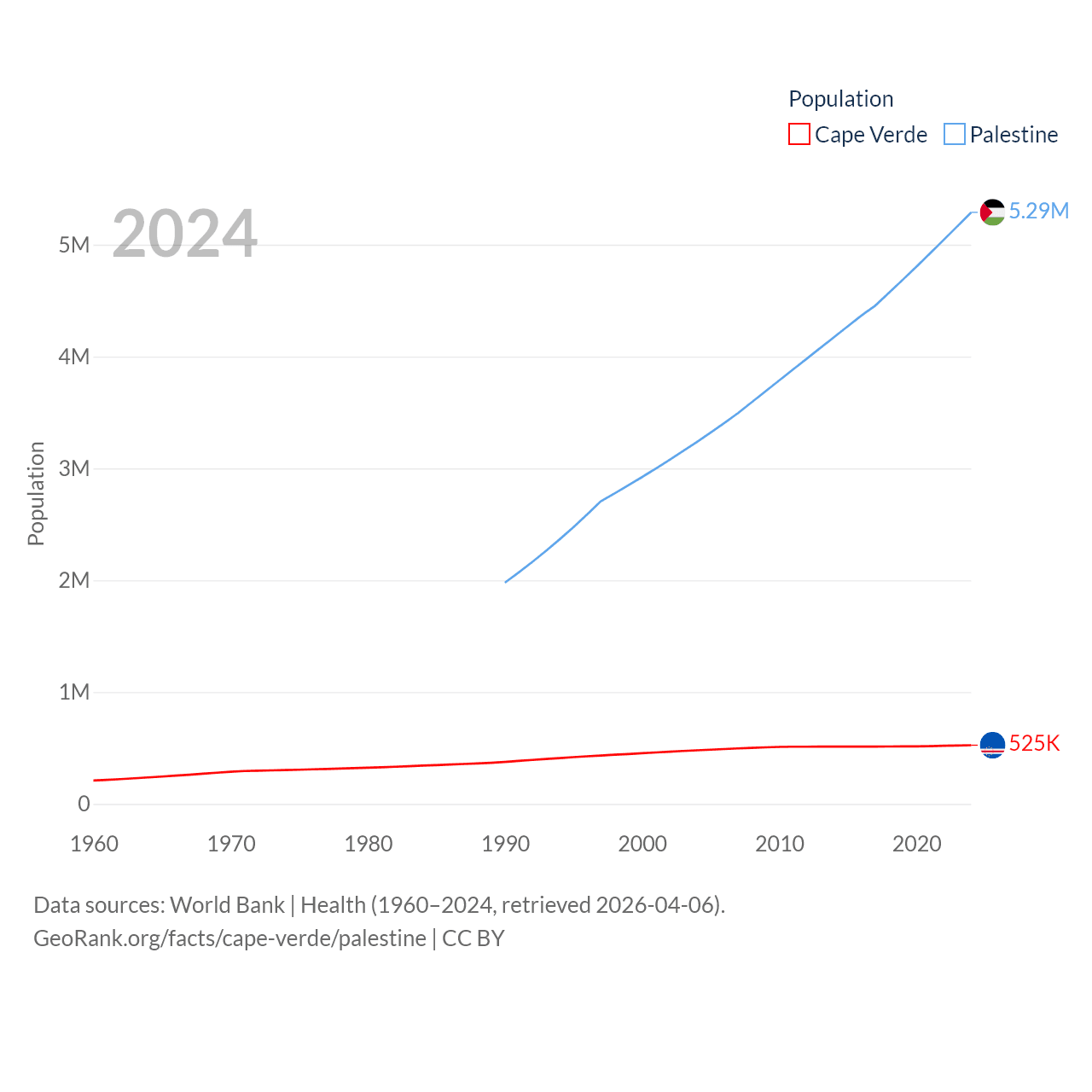 Cape Verde has a population of 525K (ranked 169/197), compared with 5.29M in Palestine (ranked 122/197). Cape Verde's land area is 1,556 sq mi versus 2,326 sq mi for Palestine (ranked 167th vs. 164th).
