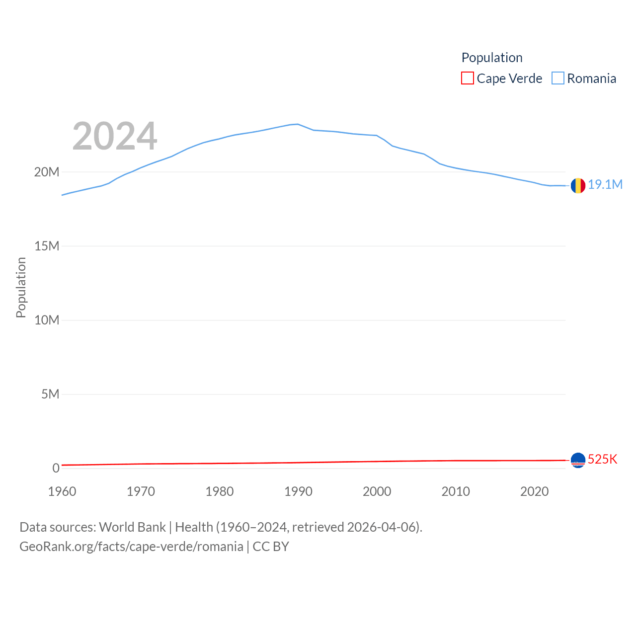 Cape Verde has a population of 525K (ranked 169/197), compared with 19.1M in Romania (ranked 67/197). Cape Verde's land area is 1,556 sq mi versus 88,834 sq mi for Romania (ranked 167th vs. 80th).