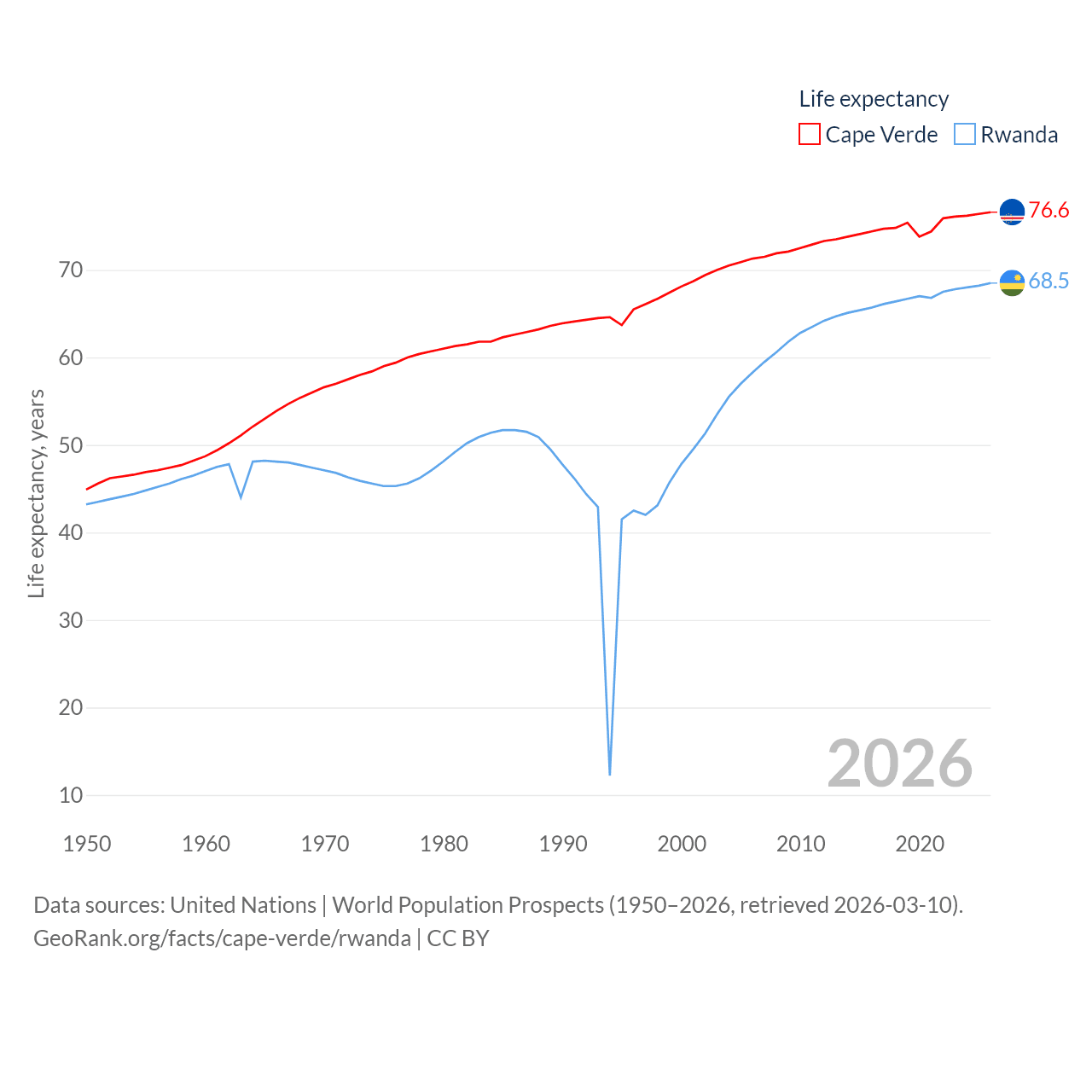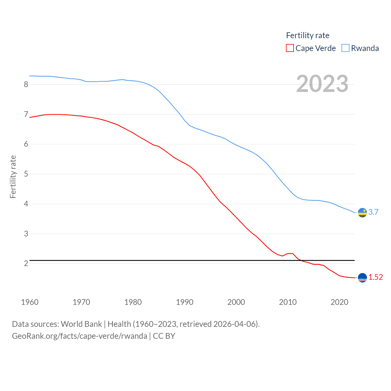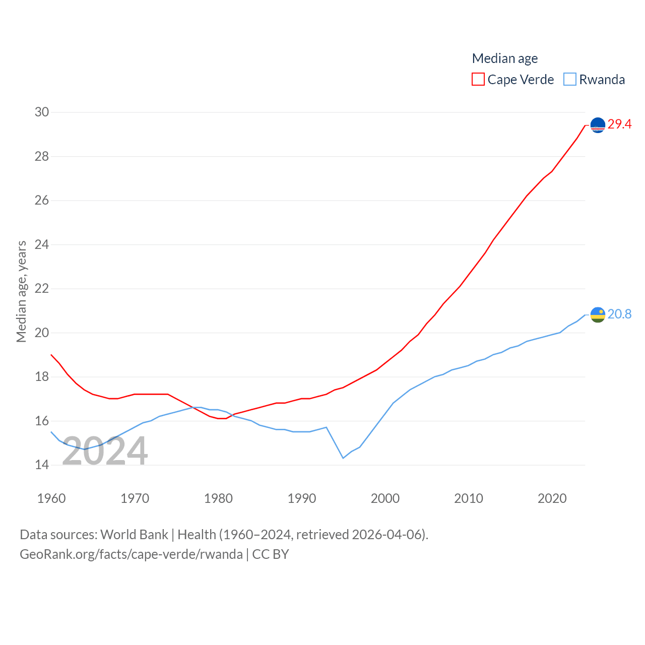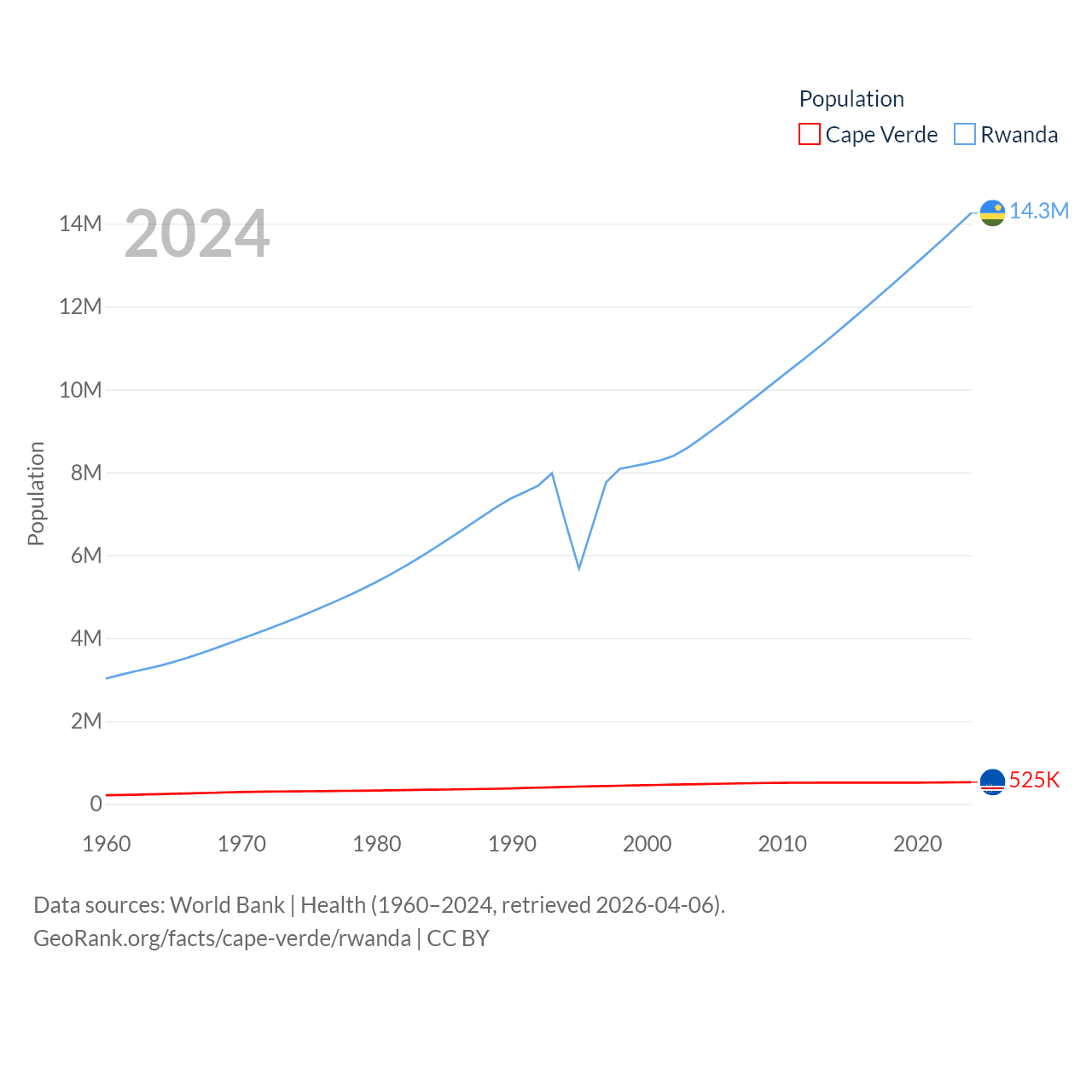 Cape Verde has a population of 525K (ranked 169/197), compared with 14.3M in Rwanda (ranked 77/197). Cape Verde's land area is 1,556 sq mi versus 9,525 sq mi for Rwanda (ranked 167th vs. 146th).