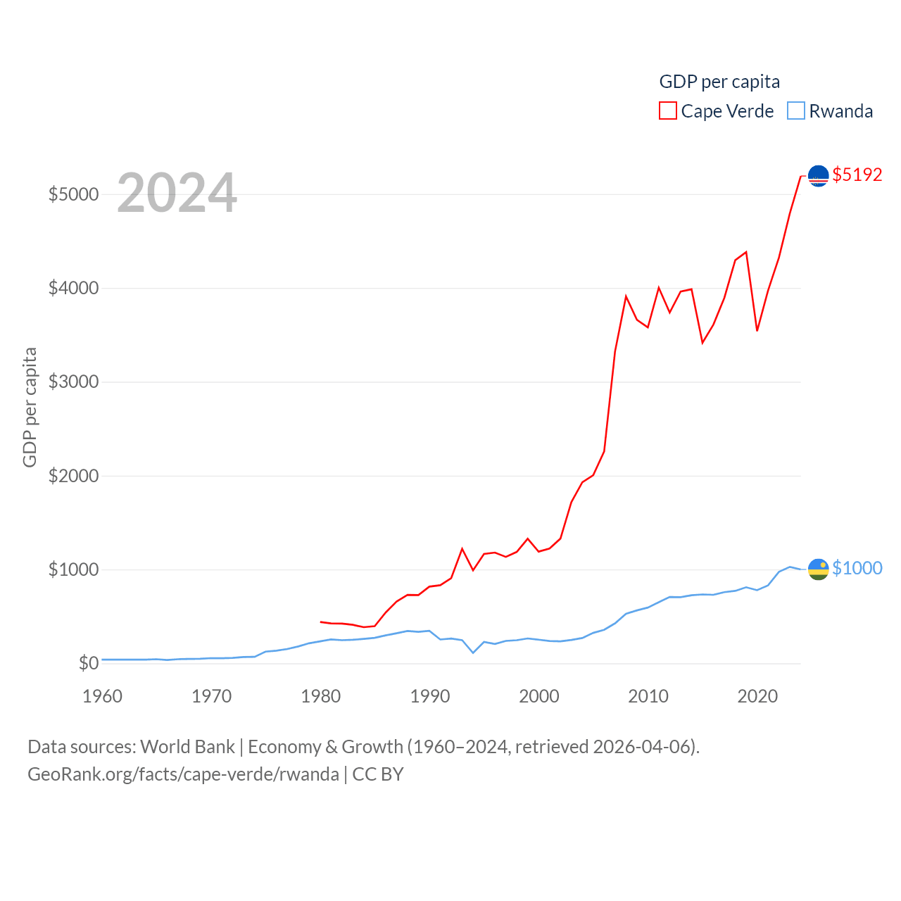 By GDP, Cape Verde ranks 172/197 ($2.73B) and Rwanda ranks 144/197 ($14.3B). By GDP per capita, Cape Verde ranks 118/197 ($5,192), while Rwanda ranks 178/197 ($1,000).