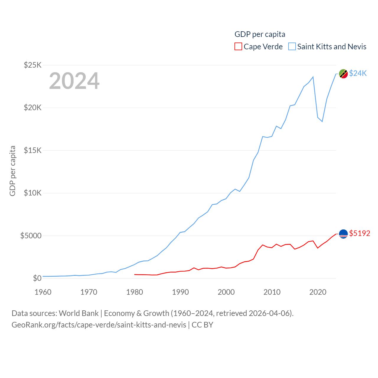 By GDP, Cape Verde ranks 172/197 ($2.73B) and Saint Kitts and Nevis ranks 187/197 ($1.12B). By GDP per capita, Cape Verde ranks 118/197 ($5,192), while Saint Kitts and Nevis ranks 51/197 ($23,961).