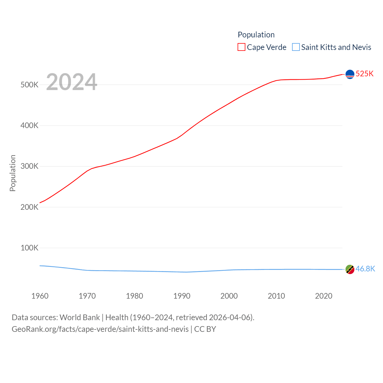 Cape Verde has a population of 525K (ranked 169/197), compared with 46.8K in Saint Kitts and Nevis (ranked 189/197). Cape Verde's land area is 1,556 sq mi versus 100.4 sq mi for Saint Kitts and Nevis (ranked 167th vs. 189th).