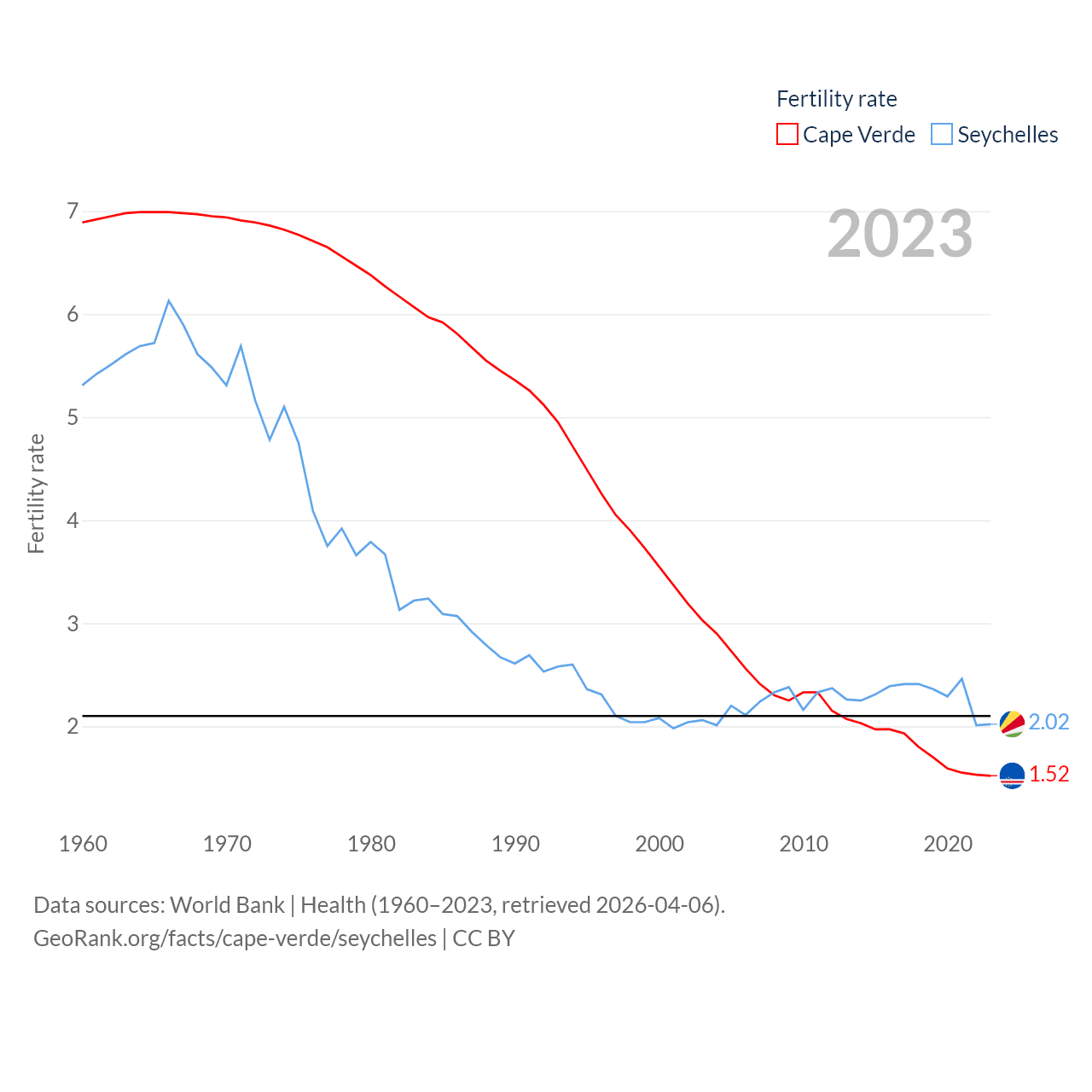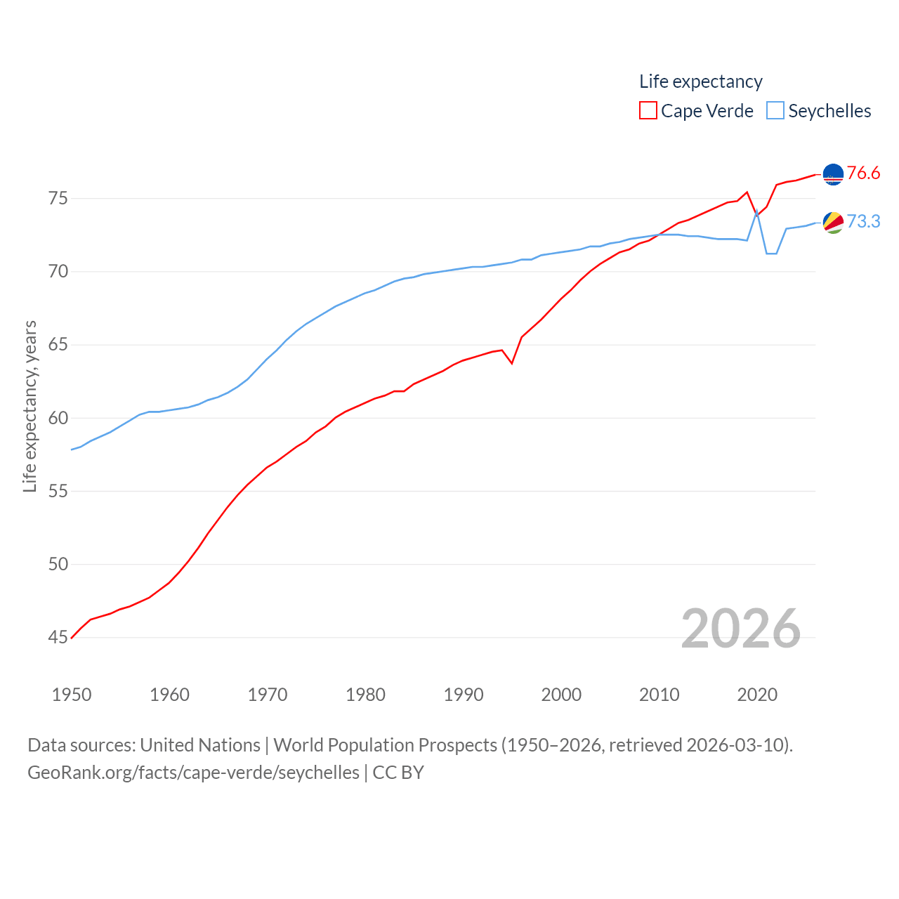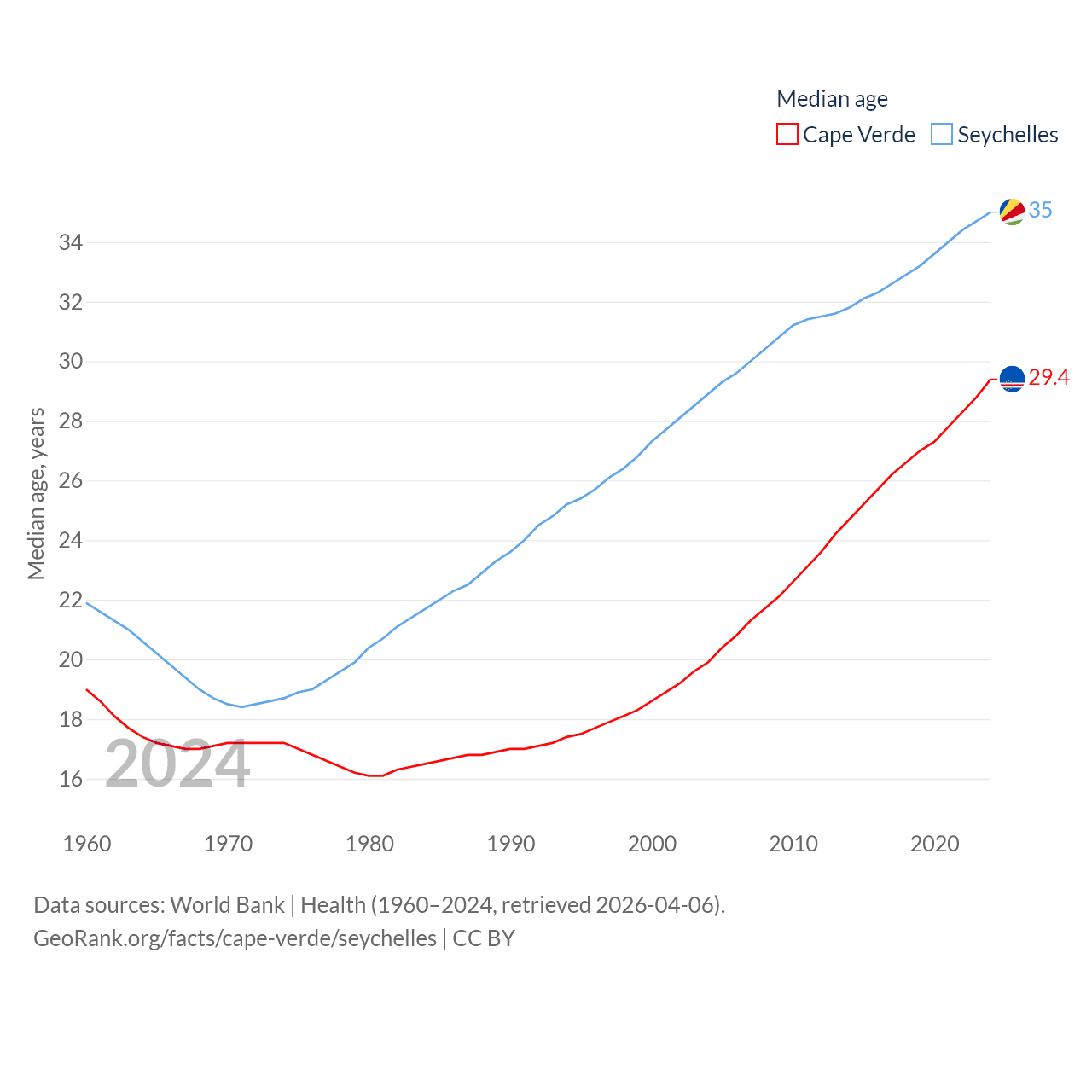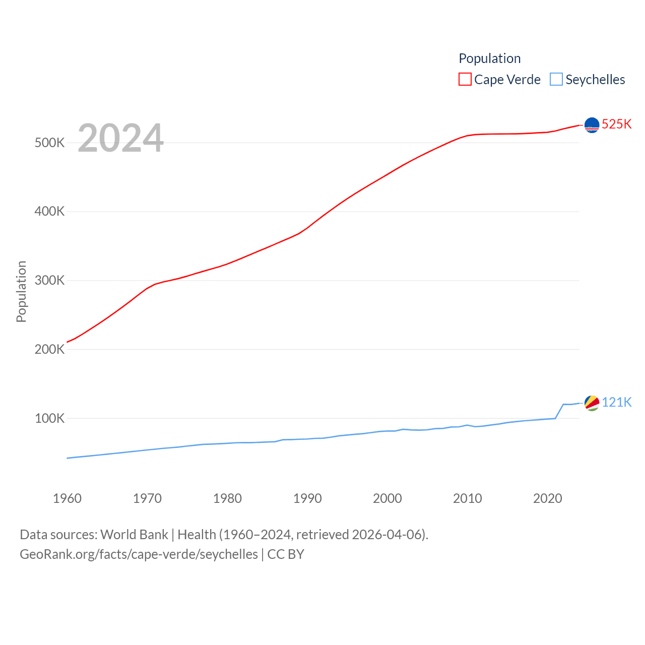 Cape Verde has a population of 525K (ranked 169/197), compared with 121K in The Seychelles (ranked 181/197). Cape Verde's land area is 1,556 sq mi versus 177.6 sq mi for The Seychelles (ranked 167th vs. 181st).