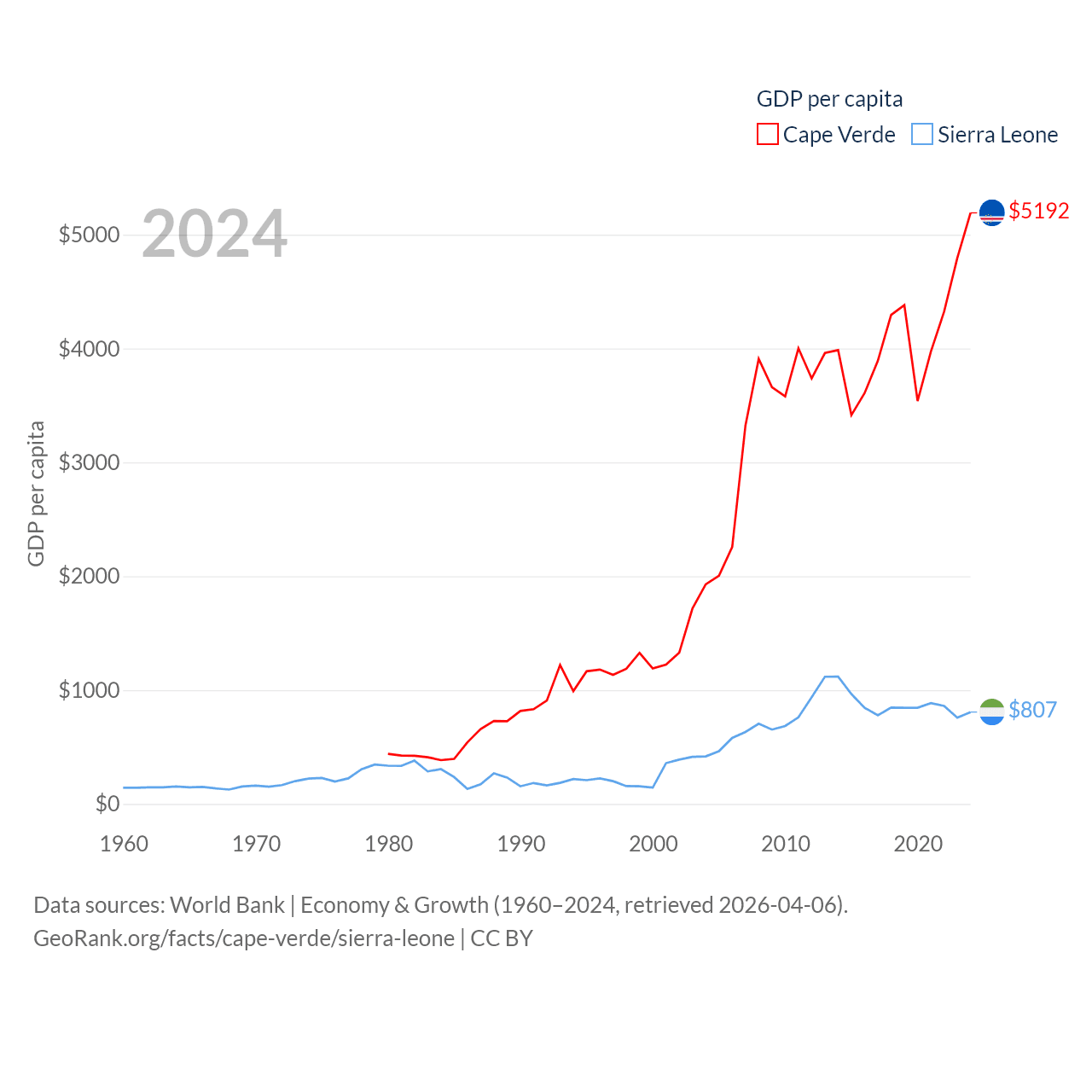 By GDP, Cape Verde ranks 172/197 ($2.73B) and Sierra Leone ranks 160/197 ($6.97B). By GDP per capita, Cape Verde ranks 118/197 ($5,192), while Sierra Leone ranks 186/197 ($807).