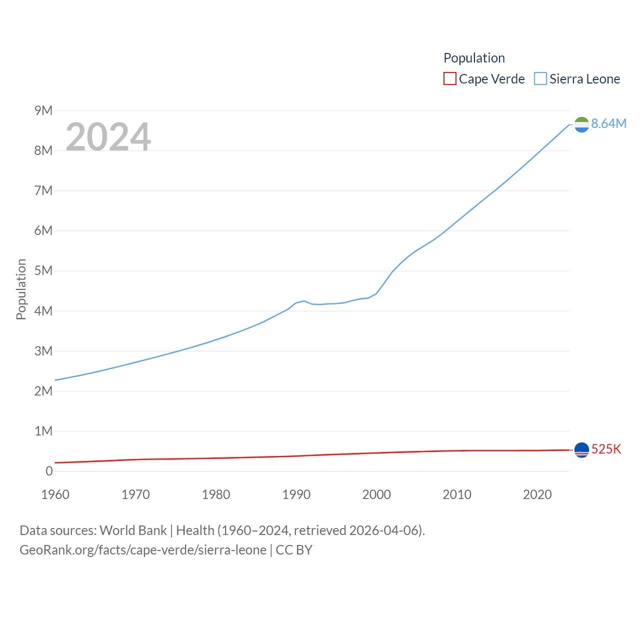 Cape Verde has a population of 525K (ranked 169/197), compared with 8.64M in Sierra Leone (ranked 102/197). Cape Verde's land area is 1,556 sq mi versus 27,869 sq mi for Sierra Leone (ranked 167th vs. 116th).