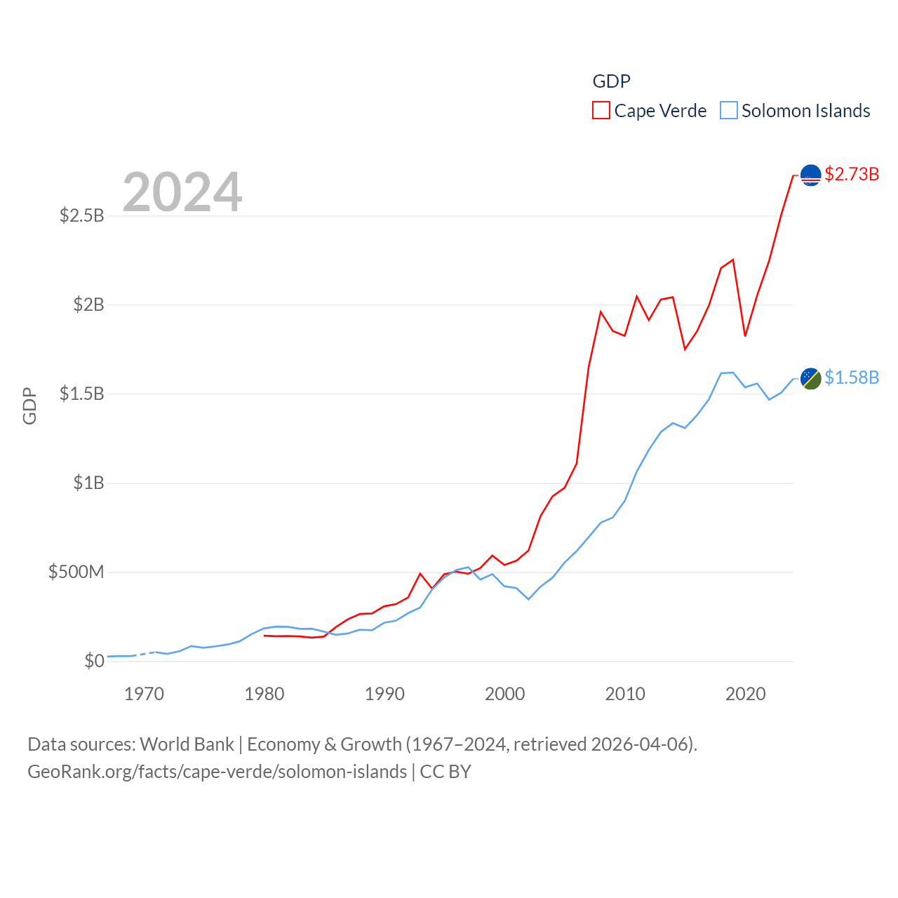 By GDP, Cape Verde ranks 172/197 ($2.73B) and The Solomon Islands ranks 182/197 ($1.58B). By GDP per capita, Cape Verde ranks 118/197 ($5,192), while The Solomon Islands ranks 157/197 ($1,934).