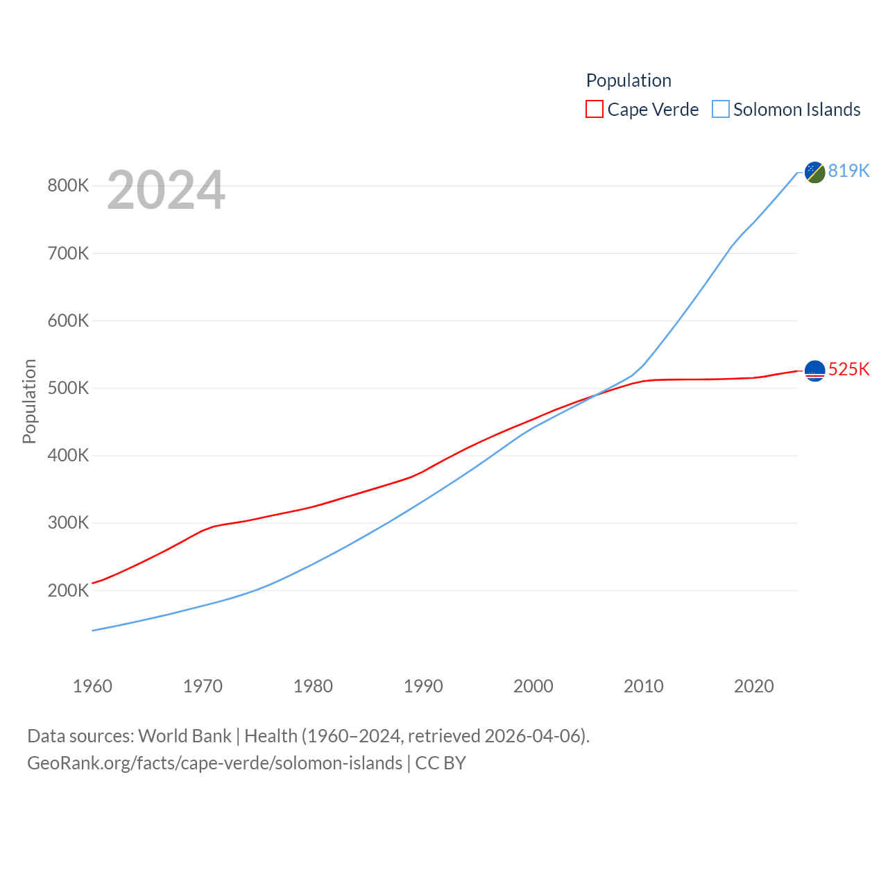 Cape Verde has a population of 525K (ranked 169/197), compared with 819K in The Solomon Islands (ranked 162/197). Cape Verde's land area is 1,556 sq mi versus 10,807 sq mi for The Solomon Islands (ranked 167th vs. 141st).