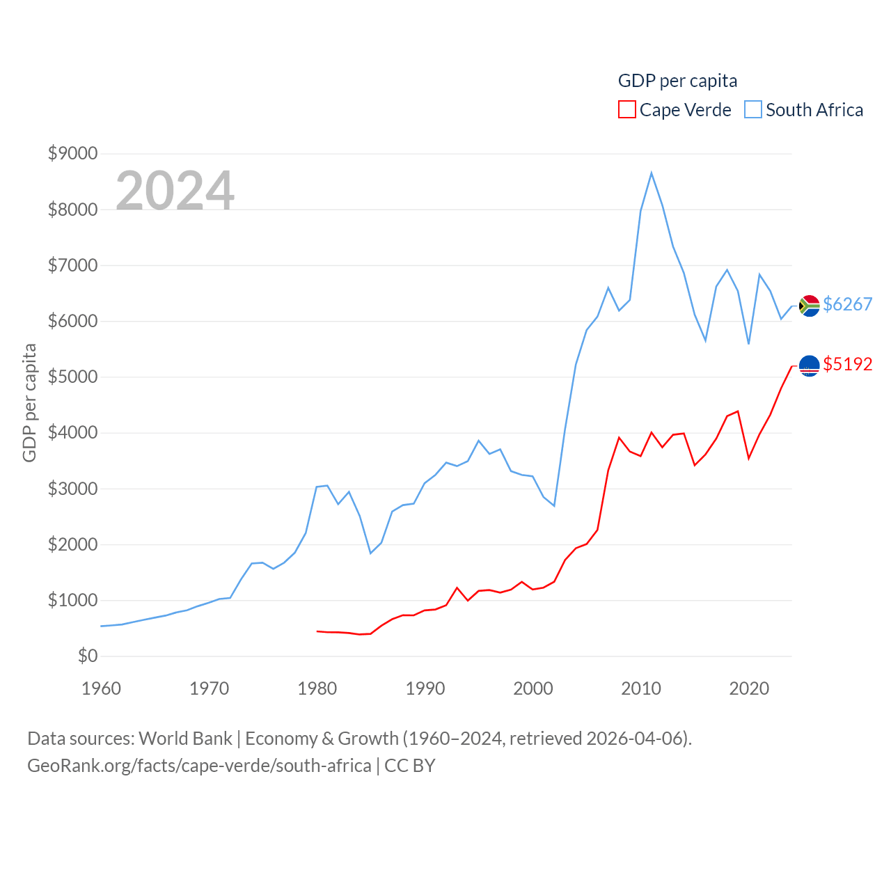 By GDP, Cape Verde ranks 172/197 ($2.73B) and South Africa ranks 40/197 ($401B). By GDP per capita, Cape Verde ranks 118/197 ($5,192), while South Africa ranks 111/197 ($6,267).