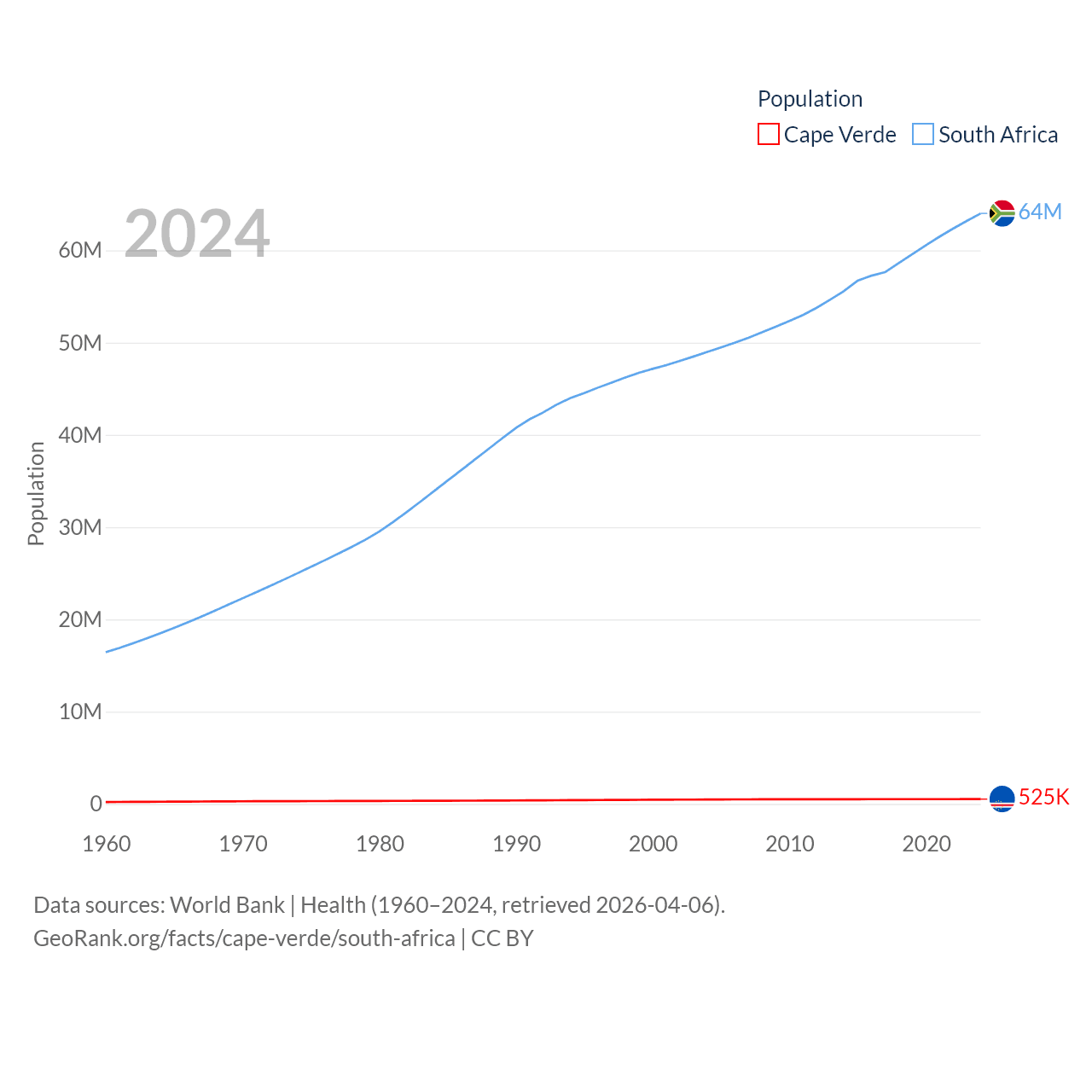 Cape Verde has a population of 525K (ranked 169/197), compared with 64M in South Africa (ranked 24/197). Cape Verde's land area is 1,556 sq mi versus 468,377 sq mi for South Africa (ranked 167th vs. 24th).